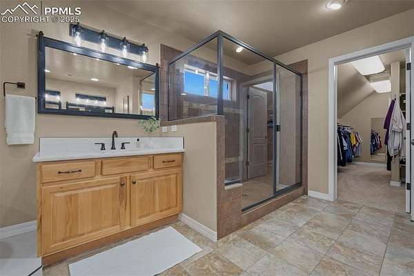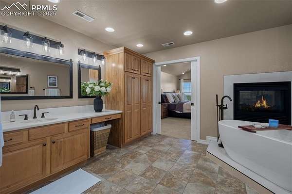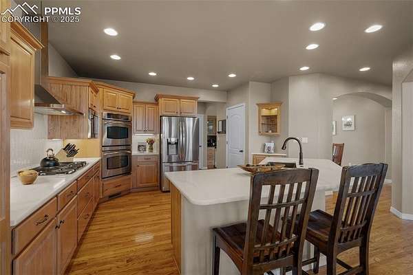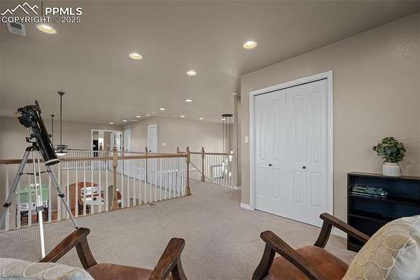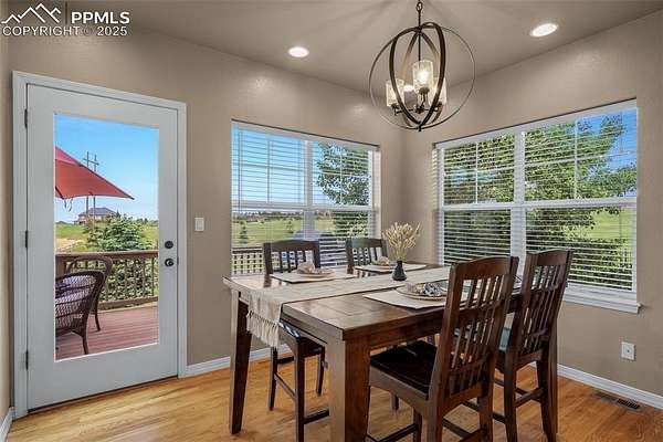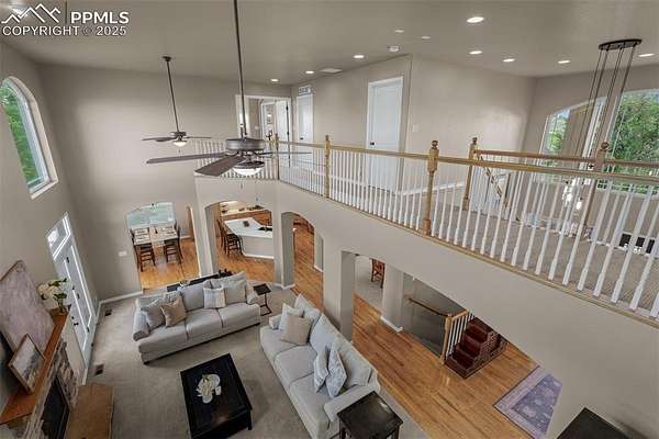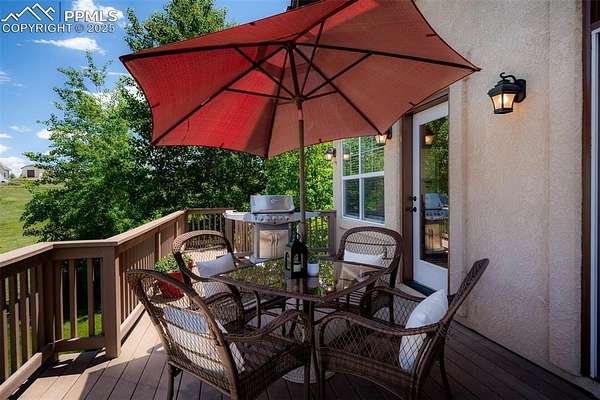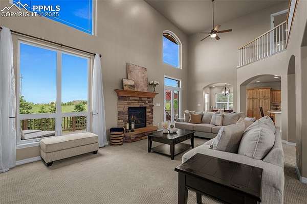 Welcome to this exquisite luxury home in the prestigious Kings Deer neighborhood of Monument, Colorado-set on a private, beautifully landscaped acreage just minutes from the golf course. This custom-designed Goetzman home has been lovingly maintained by its original owners and offers a blend of timeless elegance and modern updates throughout. Step inside to soaring tall ceilings, rounded stairs, new lighting, beautiful hardwood floors, textured carpet, and three fireplaces that create warmth and character. The newly renovated chef's kitchen is a showstopper, featuring quartz countertops, stainless steel appliances, a beverage bar, and a unique butterfly bar that opens into the living room for seamless, open-concept living. A cozy informal dining area, beautiful formal dining room, custom mudroom with built-ins, and a spacious four-car oversized garage add everyday convenience and luxury. The primary suite is a true retreat, complete with a see-through fireplace, sitting area, breathtaking views, a huge walk-in closet, and an updated spa-like bathroom. Enjoy the outdoors from your low-maintenance deck with serene mountain views, or relax in the immaculately landscaped yard filled with colorful perennials. The walkout basement offers even more space with additional bedrooms, a large living area, home theater equipt with all theater and sound equipment, workout room, and plenty of storage. With custom front door with sidelights, and incredible attention to detail throughout, this home is the perfect blend of elegance, comfort, and privacy. Welcome to your dream home in Kings Deer! This is one of Colorado's Finest.