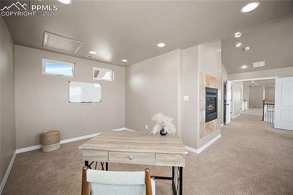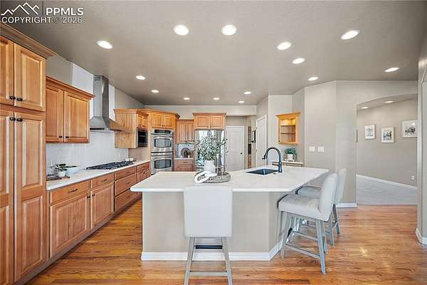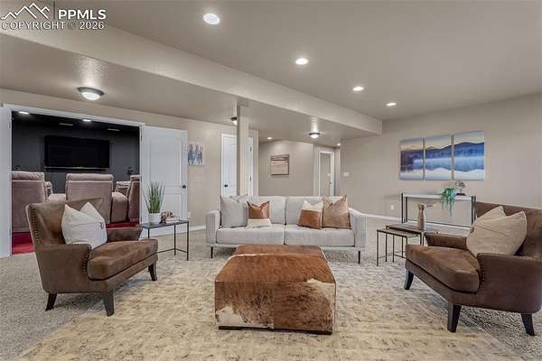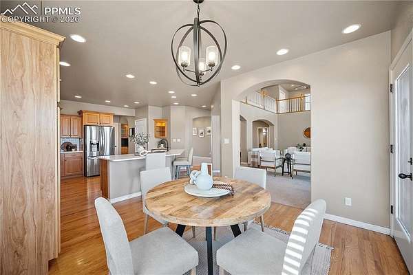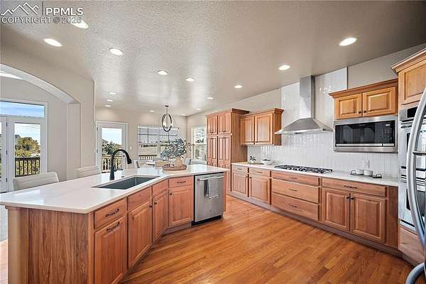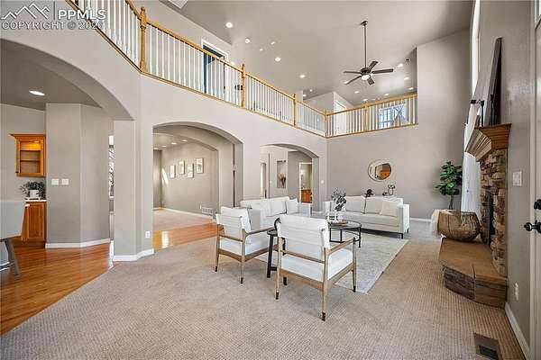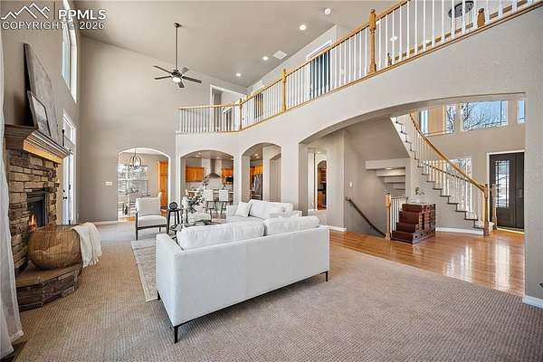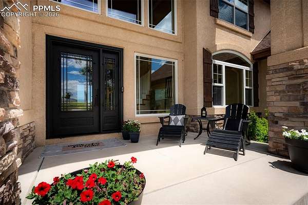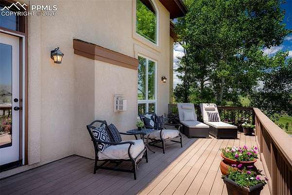 Welcome to this exquisite luxury home in the prestigious Kings Deer neighborhood of Monument, Colorado-set on a private, beautifully landscaped acreage just minutes from the golf course. This custom-designed Goetzman home has been lovingly maintained by its original owners and offers a blend of timeless elegance and modern updates throughout. Step inside to soaring tall ceilings, rounded stairs, new lighting, beautiful hardwood floors, textured carpet, and three fireplaces that create warmth and character. The newly renovated chef's kitchen is a showstopper, featuring quartz countertops, stainless steel appliances, a beverage bar, and a unique butterfly bar that opens into the living room for seamless, open-concept living. A cozy informal dining area, beautiful formal dining room, custom mudroom with built-ins, and a spacious four-car oversized garage add everyday convenience and luxury. The primary suite is a true retreat, complete with a see-through fireplace, sitting area, breathtaking views, a huge walk-in closet, and an updated spa-like bathroom. Enjoy the outdoors from your low-maintenance deck with serene mountain views, or relax in the immaculately landscaped yard filled with colorful perennials. The walkout basement offers even more space with additional bedrooms, a large living area, home theater equipt with all theater and sound equipment, workout room, and plenty of storage. With custom front door with sidelights, and incredible attention to detail throughout, this home is the perfect blend of elegance, comfort, and privacy. Welcome to your dream home in Kings Deer! This is one of Colorado's Finest.