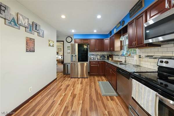 Welcome to 19740 Benbow Rd in Strongsville - a private ranch retreat nestled on 1.51 acres! This expansive property offers the perfect blend of comfort, space, and convenience. With 4 spacious bedrooms and 2.5 baths, this home is designed for both everyday living and entertaining. The heart of the home is the recently updated eat-in kitchen, featuring rich cherry wood soft-close cabinets, granite countertops, and stainless steel appliances that stay. Just off the kitchen is a cozy living space perfect for casual gatherings, while the second living area offers warmth and charm with its wood or gas-burning fireplace-ideal for relaxing evenings. The primary suite addition is a true sanctuary, complete with a massive walk-in closet, a luxurious en suite with jetted tub and separate shower, and a dedicated work-from-home nook. A second full bathroom is conveniently located between the other bedrooms, and a half bath is tucked near the fireplace lounge for guests. Downstairs, the finished, waterproofed basement expands your possibilities-ideal for a theatre room, game room, or man cave-plus a flex room perfect for an office. Additional storage options include unfinished basement space and two crawl spaces. Enjoy peaceful mornings or host summer get-togethers on the wrap-around deck, accessible from the primary suite or back hallway. A two-car attached garage and a versatile two-story outbuilding with electric and heat provide ample space for hobbies, storage, or additional vehicles. Located minutes from freeways, shopping, restaurants, and Strongsville's top-rated community amenities, this home offers privacy without sacrificing convenience. Don't miss your chance to own a rare gem in Strongsville with room to roam and space to grow!