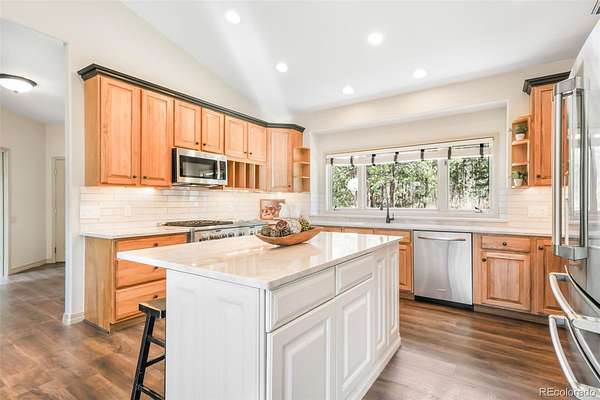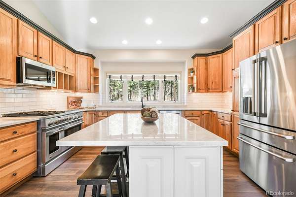 This ranch-style home with a full walk-out basement delivers a well-designed layout with elevated finishes and thoughtful updates throughout. Recently repainted, the interior feels fresh and refined, while the gourmet kitchen has been enhanced with new countertops and a modern backsplash—anchored by a standout range that defines the space. The main level is designed for effortless living and entertaining, with open-concept flow and expansive windows that frame the surrounding landscape.