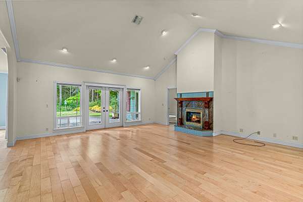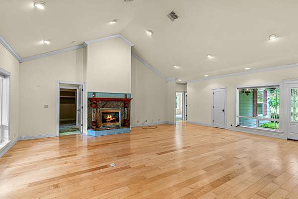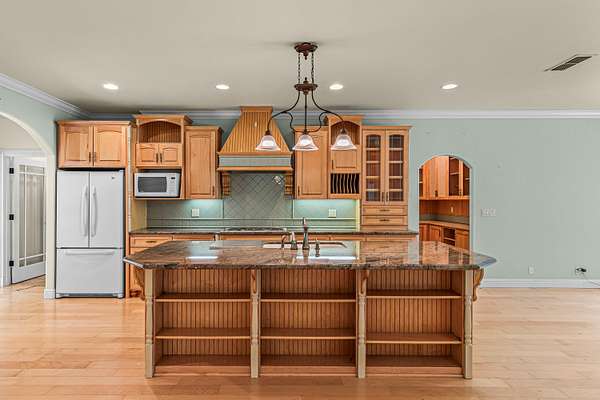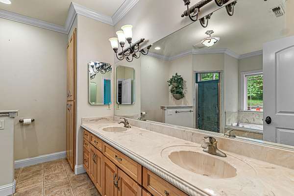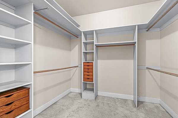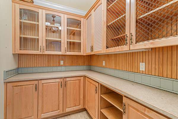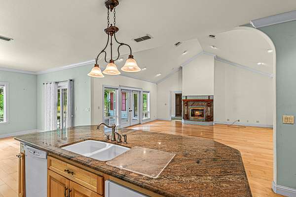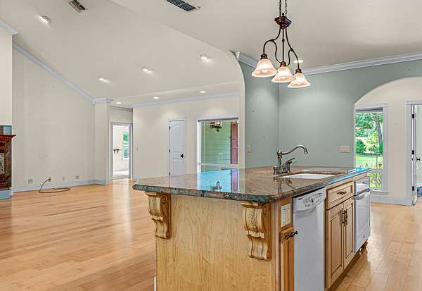 - Breakfast Bar, Built-In Features, Double Vanity, Granite Counters, High Speed Internet, Kitchen Island, Linen Closet, Open Floorplan, Pantry, Primary Downstairs, Shower/Tub Combo, Soaking Tub, Solid Surface Counters, Stone Counters, Vaulted Ceiling(s), Walk-In Closet(s)