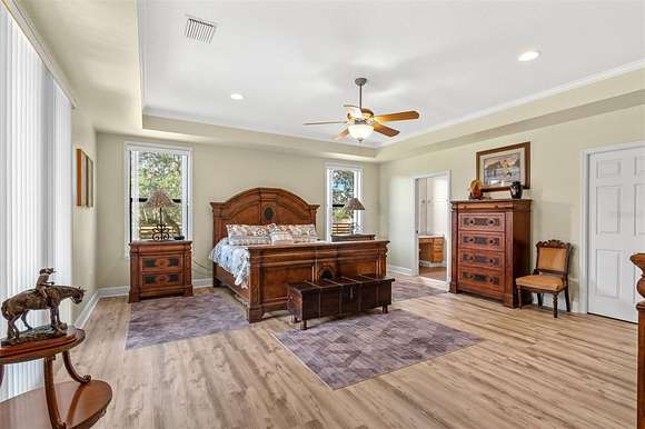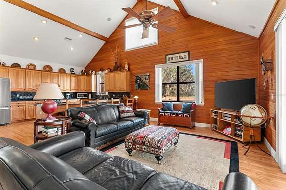 The custom-built main house is the heart of the ranch. Designed for entertaining and family gatherings, the home offers glorious waves of natural sunlight and spectacular views of the surrounding ranch. The welcoming front porch boasts gorgeous sunset views across Lake Buffum and the land. The timeless exterior is built to withstand the Florida seasons with a metal roof, and a 25 kW whole home generator. As you step through the front doors you will be welcomed into the open and airy main living area that flows seamlessly into the dining room and kitchen. Custom cypress woodwork, vaulted ceilings, hickory hardwood floors and cabinets, exposed beams, high-end finishes, and meticulous maintenance are some of the reasons why this home makes such a unique and lasting impression. The two-story home provides extreme privacy as the second bedroom and full bath are upstairs, next to the loft office. The master bedroom suite provides a sanctuary to relax with a gas fireplace, an ensuite bathroom with double vanity, walk-in-closet, and private access to the front porch where a hot tub awaits for you to unwind and enjoy the breathtaking country sunsets.