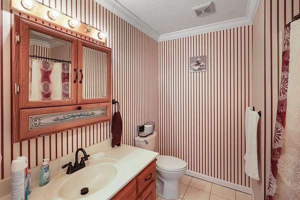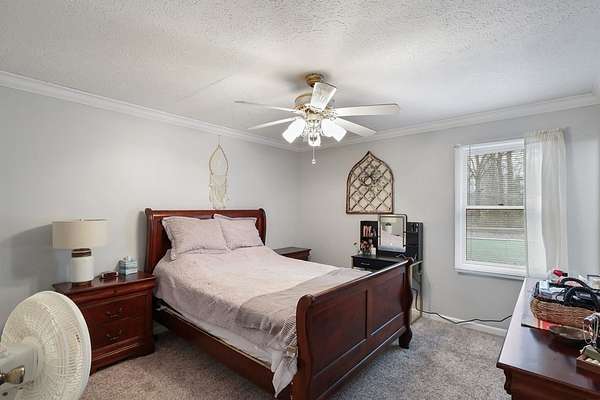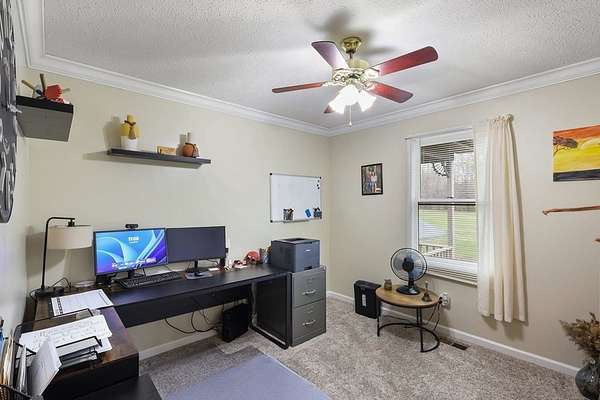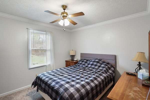 - Ceiling Fan(s), Crown Moulding, Floors-Tile, Mini Blinds