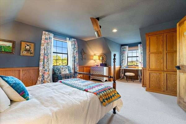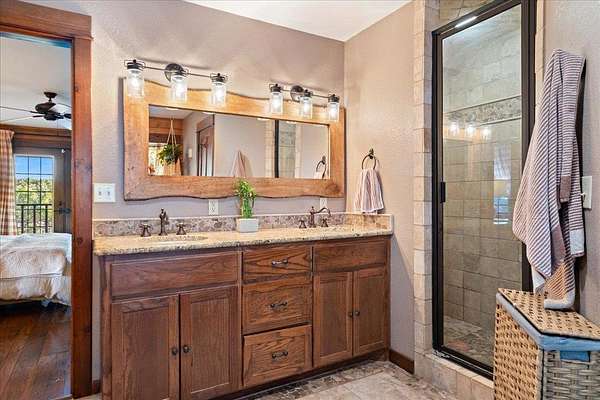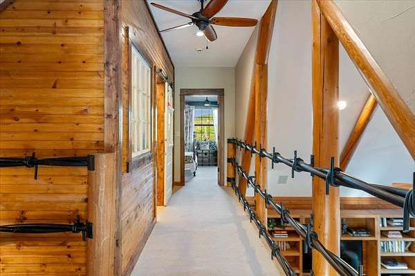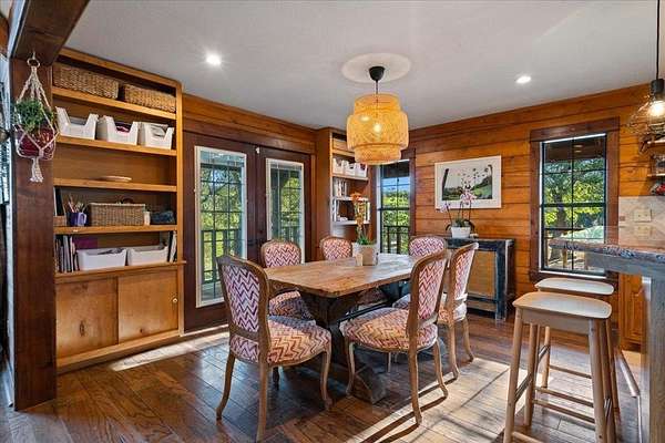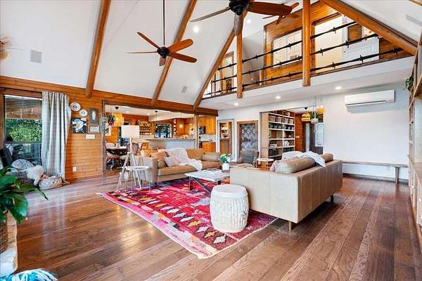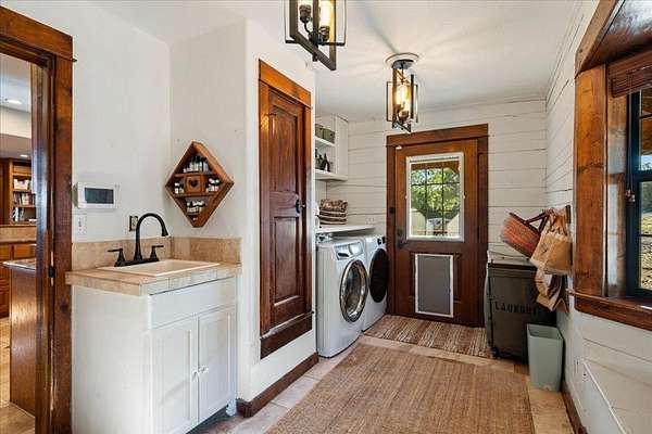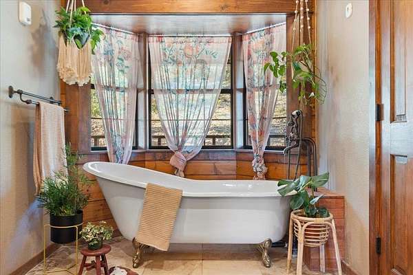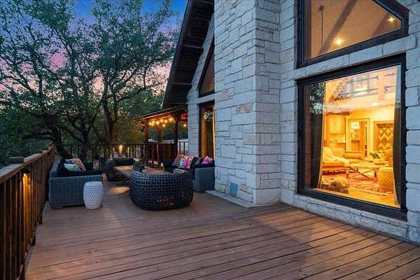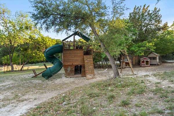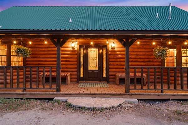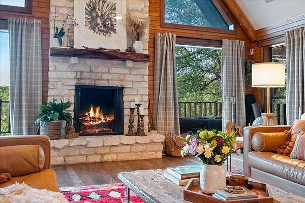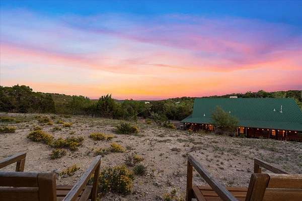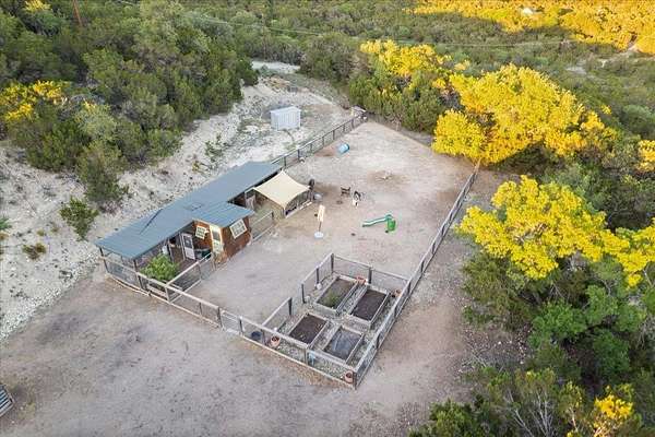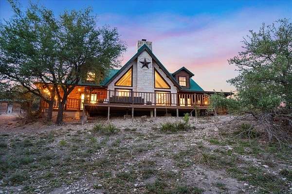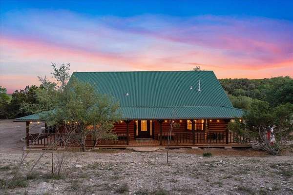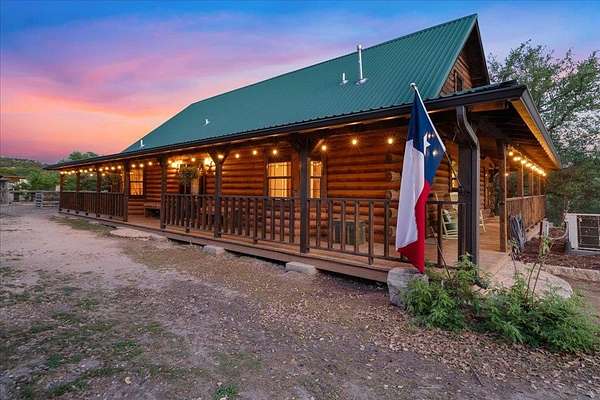 Welcome to Texas Hill Country living! No HOA, city taxes, or MUD! This 3-bedroom, 2.5-bath log home with the green metal roof sits on nearly 8 oak-filled acres with winding trails. It features a custom stone gated entry and is completely fenced for added privacy. From the wrap-around porch, step inside to find a sunlit, open-concept living room with a vaulted beamed ceiling, stone fireplace, and built-in bookshelves. The spacious kitchen flows into the dining area and out to a large deck overlooking the property, perfect for welcoming the day or enjoying the stars at night. The first-floor primary suite includes a bathroom with his-and-her closets, a clawfoot soaking tub, separate shower, and another set of French doors leading to the deck and garden views. Upstairs you'll find two spacious bedrooms at each end of an open hallway overlooking the living room, and an enclosed loft with vintage windows - the perfect office or art studio space. Back downstairs, a large laundry room with sink and extra storage makes a great mudroom after gardening or hiking through the woods. Outside, the rolling terrain makes the property feel even larger than it is, offering space to add on and still enjoy roaming the back woods. The huge barn features enormous sliding doors, a separate enclosed and air-conditioned office or studio, and lots of extra storage space. So many possibilities! Whether you want to utilize the existing animal structures and garden and start your own dream farm, or use the space to create a dream resort-style pool and cabana, this property is just waiting to be your private escape. Perfect for full time living, private retreat, or short term rental. Although it feels miles away from anything, you're actually just 5 minutes from Lago Vista, 20 minutes from Cedar Park, and 40 minutes from downtown Austin. Access to Lake Travis is right in Jonestown.