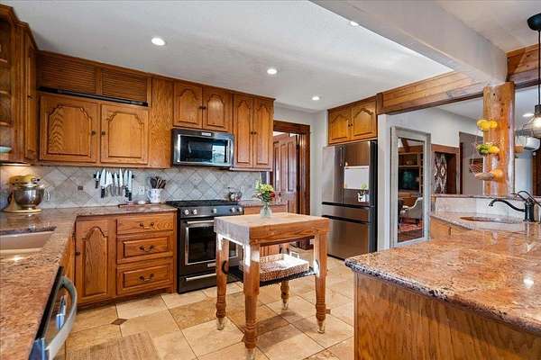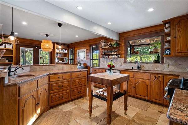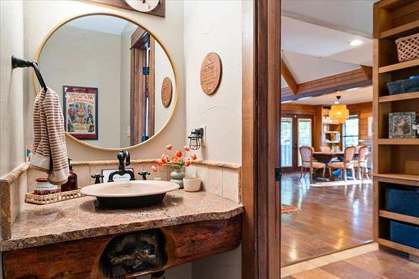 - Beamed Ceilings, Bookcases, Breakfast Bar, Built-In Features, Cathedral Ceiling(s), Ceiling Fan(s), Ceiling-High, Crown Molding, Double Vanity, Entrance Foyer, Granite Counters, High Speed Internet, Interior Steps, Kitchen Island, Natural Woodwork, Open Floorplan, Pantry, Primary Bedroom On Main, Recessed Lighting, Soaking Tub, Two Primary Closets, Walk-In Closet(s), Wired For Sound