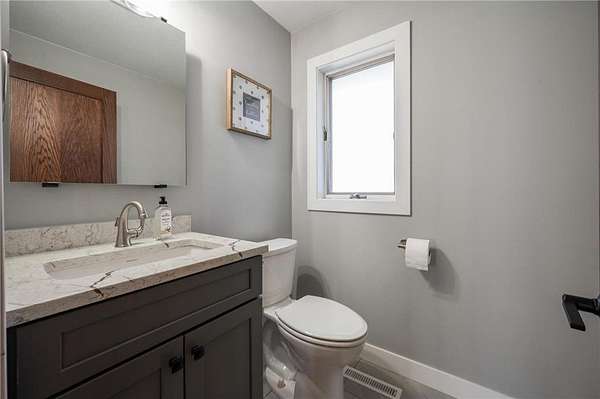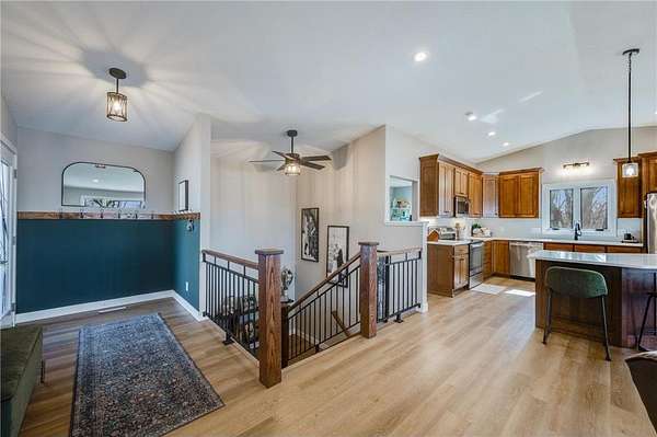 Step inside to a newly renovated main living area featuring an open floor plan with soaring vaulted ceilings and abundant natural light. The custom kitchen is the heart of the home, showcasing newer cabinetry, quartz countertops, stainless steel appliances, updated lighting, and seamless flow into the dining and living spaces—ideal for both daily living and entertaining. A convenient half bath is also located on the main level.