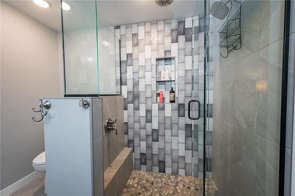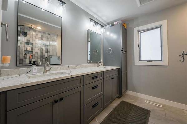 The primary suite offers a private retreat with dual closets, a walk-in tiled shower with glass doors, double quartz vanity, and heated tile floors for added comfort.
