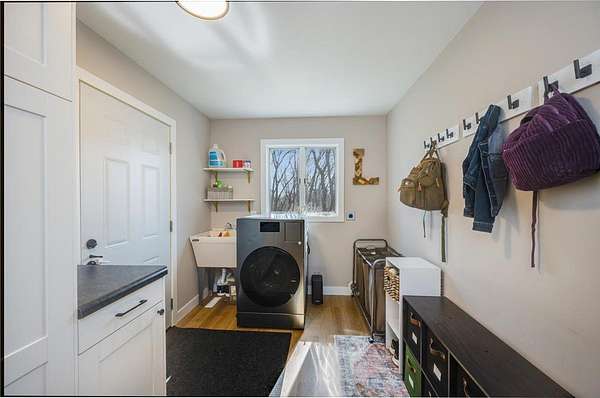 Additional features include a newly stained exterior, redesigned mudroom/laundry room with utility sink, custom cabinetry, and new combo washer/dryer with ventless heat pump technology, attached two-stall garage, new shed/playhouse, recently cleared and improved land, and thoughtful updates throughout.