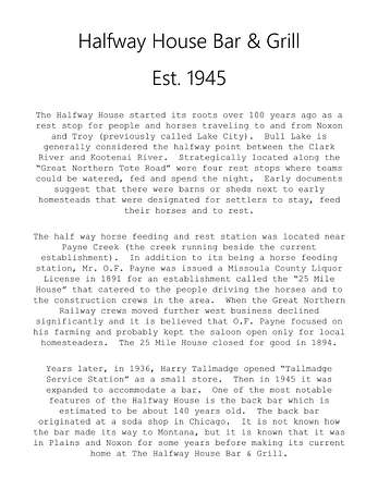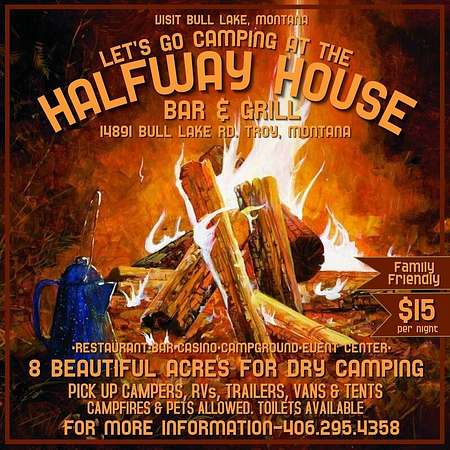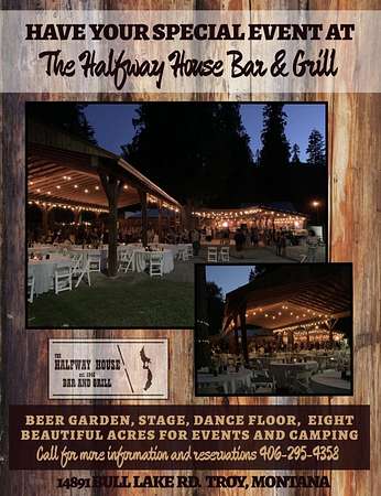From Troy/Libby turn onto HWY 56/Bull Lake RD, go approximately 10 miles, Halfway House Bar & Grill will be on your left. From Noxon/Heron area, Turn onto HWY 56/Bull Lake RD, go approximately 16 miles, the Halfway House will be on your right.