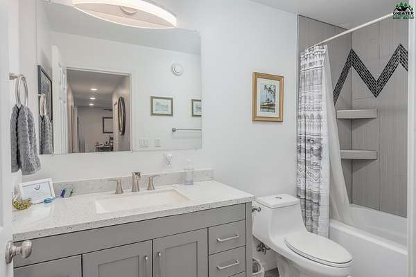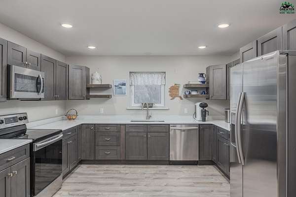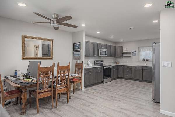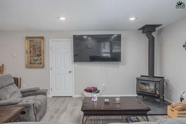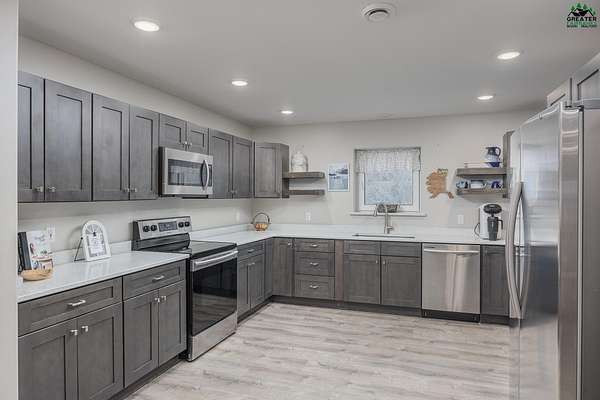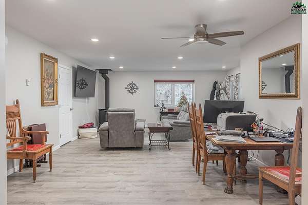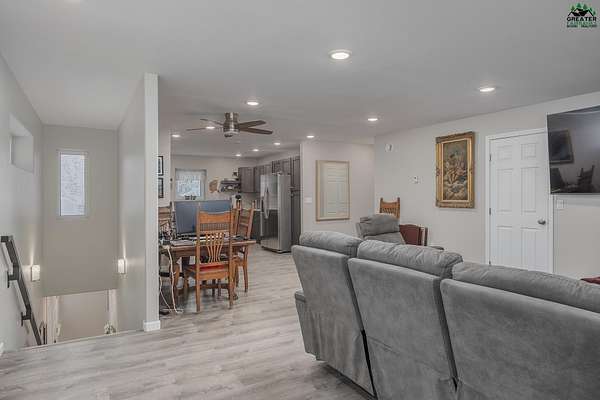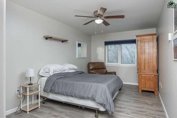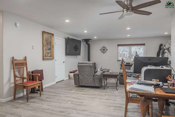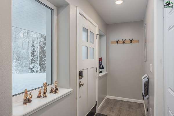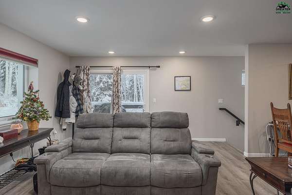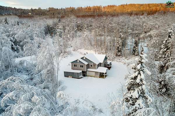 This two-level home offers a unique dual-access layout, allowing entry from either the upper or lower portion of the property. Parking is available at the upper driveway, providing direct walk-in access to the main living space, or at the lower level, where the garage and additional parking are located. This flexible access supports everyday convenience across all seasons. The main living area features an open-concept kitchen, dining, and living room, designed for efficient flow and natural gathering. Luxury vinyl flooring runs throughout, offering durability and easy maintenance. Radiant in-floor heating provides consistent warmth, contributing to year-round comfort and energy efficiency. The home includes three bedrooms and two full bathrooms arranged across two levels. Utility systems include a private water holding tank and a newly installed septic system, offering updated infrastructure. Heating demands are minimized by the radiant floor system, supporting comfortable interior temperatures even during colder months. The property sits on approximately 1.8 acres, surrounded by mature trees that provide privacy and a natural setting. The lot offers additional space for future development, outbuildings, or expanded outdoor use, subject to buyer plans and local requirements. No fencing is currently in place, allowing flexibility for future land use decisions. Located in the Chena Point Heights area, the property provides a balance of privacy and access to Fairbanks amenities. Outdoor recreation, parks, and river access are within driving distance, along with shopping, dining, and services in Fairbanks. A well-designed home with adaptable access, efficient systems, and land potential in a peaceful setting.