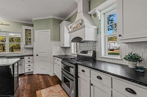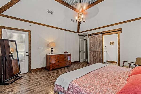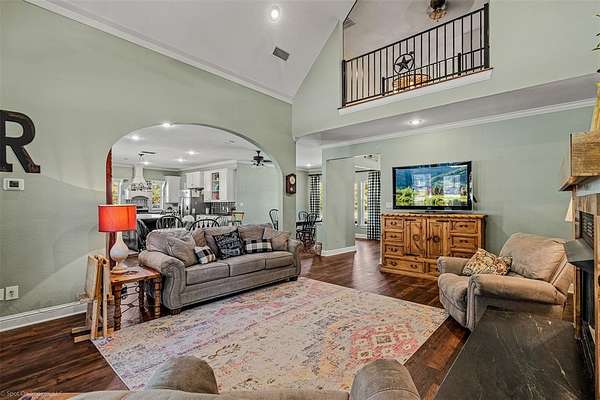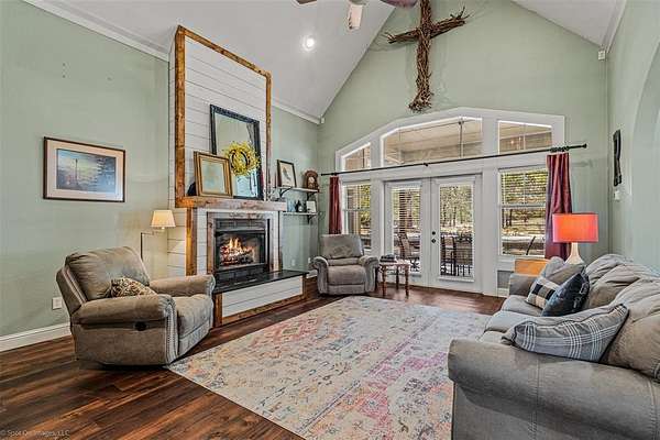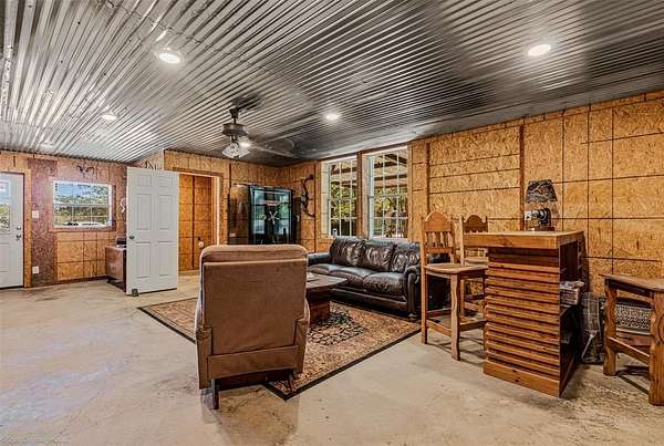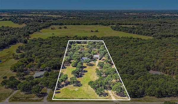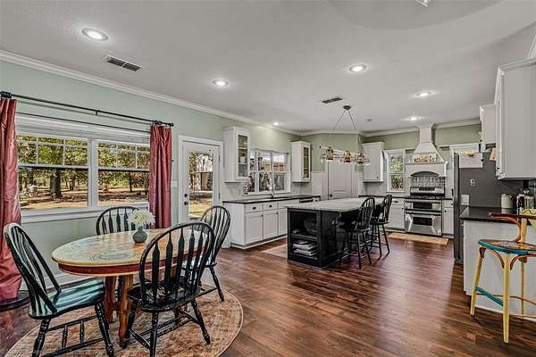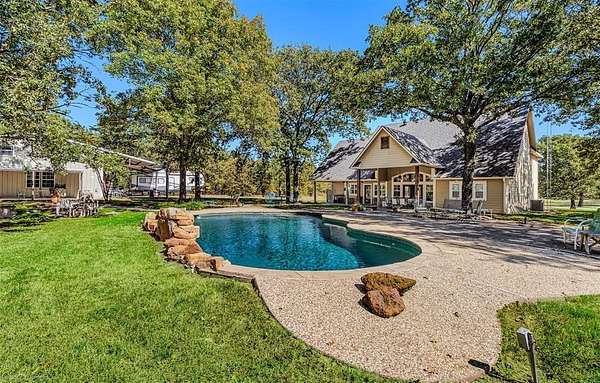 Charming Farmhouse on 10 Acres with Pool, Shop & Guest Quarters Near Lake Fork! Escape to your own private retreat on 10.29 picturesque acres, featuring an in-ground pool, shop with guest quarters, and a pond surrounded by oak trees. Nestled at the end of a quiet dead-end county road, this property offers peace, privacy, and abundant wildlife! A pipe fence and security gate frame the entrance, and the acreage is fully fenced and cross-fenced. Inside this modern farmhouse, rustic charm meets thoughtful updates. Open-concept living area with a vaulted ceiling, shiplap gas-log fireplace, and seamless flow from kitchen to dining and living spaces--perfect for entertaining or family gatherings.