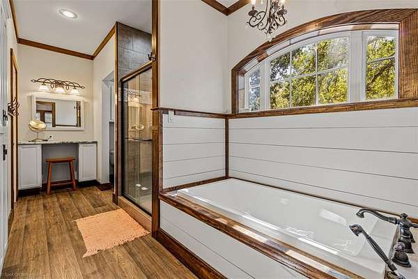 - Chandelier, Decorative Lighting, Double Vanity, Eat-In Kitchen, Granite Counters, High Speed Internet Available, Kitchen Island, Natural Woodwork, Open Floorplan, Pantry, Vaulted Ceiling(s), Walk-In Closet(s)