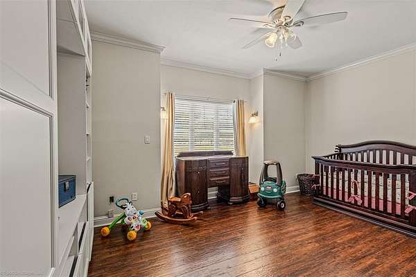 The main level offers two bedrooms and two baths, including a luxurious primary suite with a vaulted, beamed ceiling, private porch access, and a spa-like bath with soaking tub, walk-in shower, and dual vanity. Upstairs, you'll find two spacious bedrooms, a full bath, and a soundproof media room ideal for movie nights or gaming. The open landing provides a lovely view over the living area below.