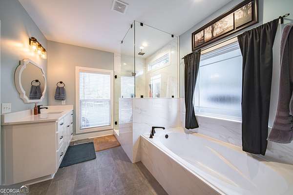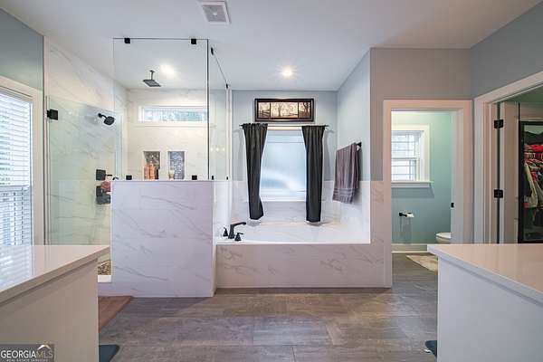 - Beamed Ceilings, Double Vanity, Entrance Foyer, Master On Main Level, Separate Shower, Soaking Tub, Split Bedroom Plan, Tile Bath, Tray Ceiling(s), Vaulted Ceiling(s), Walk-In Closet(s), Wet Bar