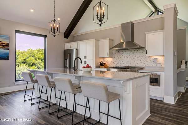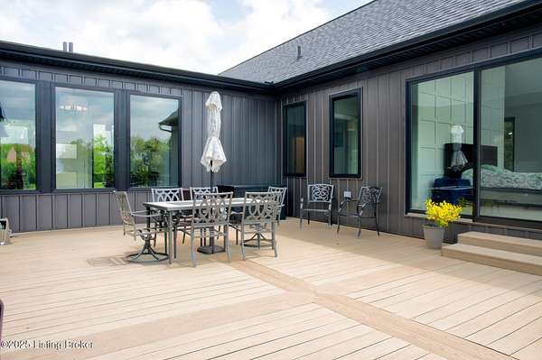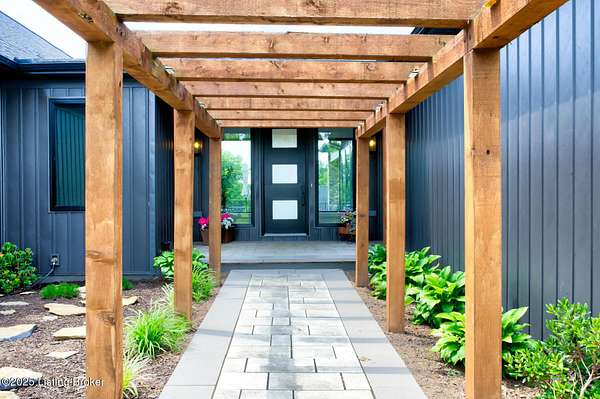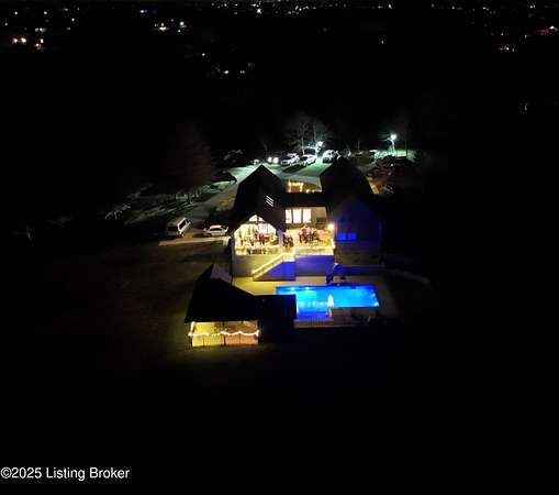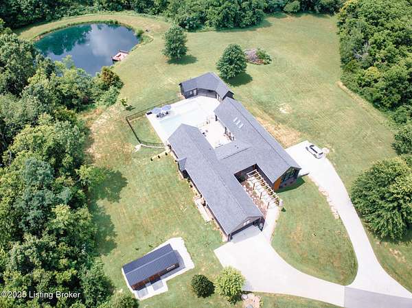 Prepare to be WOWED with this unique and stunning 3 year ''new'' home. Built by Schumacher Homes and completed in December of 2022, this open plan is an entertainer's dream, both inside and outdoors. Located in Spencer County on a private 9 acres, this home features an incredible outdoor space which includes a 20x40 in ground pool with pool deck entry and slide, pool house, full bath house, pavilion with refrigerator, covered back porch with vaulted wooden ceiling, and stocked pond. Coming up the drive, one will be impressed with the curb appeal of this home. The pavers walkway to the covered front porch is highlighted by a stained wooden pergola that complements the dark siding of the home. A real standout. The front door blends in with the modern style of the home. Once inside, you'll notice that this plan was built with views to the outside as a priority. Large windows everywhere flooding the space with natural light. The floor plan is an "H" shape with the foyer in the middle, great room, kitchen and lounge (office) on one side and the bedrooms and baths on the other. Spanning the space between the "H" outside is a fabulous and huge Timber Tech deck overlooking the pool area with entrances from the great room and primary bedroom. The great room space showcases a vaulted ceiling with beams and a gas fireplace with tile surround extending to the ceiling. A great focal point. Not to be missed is a wall of windows looking out to the rear of the property. The doors lead out to a fabulous covered patio with vaulted wooden ceiling and paved floor. The great room accommodates the dining room as well with plenty of space for a large gathering table. So now let's focus on the amazing kitchen. Featuring white cabinetry and quartz counters, this kitchen hides a big surprise. The tall cabinet doors open up leading into a butler's pantry room, or "messy kitchen" in today's terms. This room serves as a walk-in pantry with wrap around solid shelving, separate storage closet, base cabinet with sink and beverage fridge and even a window with remote shades. Very cool design and amazing storage. The kitchen is outfitted with stainless Jenn-Aire appliances throughout which remain with the home. Release your inner chef with the Jenn-Aire 5 burner gas chef stove and touch control stainless hood. Around the corner from the kitchen and facing the front of the house is a lounge/office room with an expanse of windows to make the work day better. The wall unit shelves with ladder can remain. On the other side of the foyer is a coat closet and a half bath featuring quartz countertop. The primary bedroom has a vaulted ceiling and faces the back of the property overlooking the pool area and pond. There is an accent wall for your headboard which adds a nice touch. Across from the bed is a wall of windows, maximizing the view for the perfect wake-up call or star gazing in the evening. Primary bedroom windows have remote shades for privacy and light blocking. The primary bath features tile floors, a soaker tub surrounded by windows, double vanity with quartz counter, walk in tiled shower with glass enclosure and a walk in closet with custom shelving. Down the hall are two other bedrooms, both with two closets. One is currently set up as an office. There is a convenient mudroom with built-in shelving and cubbies for dropping off items when entering the home. The laundry room is an efficient space with a sink cabinet, and two wall mounted fold up/down tables for ease of doing laundry. The washer and dryer can remain with the home. The basement walkouts to the side of the house and here you'll find a finished bedroom, family room and a full bath with walk in tiled shower. There is also an area plumbed for a kitchen. And an amazing amount of space for storage or future expansion. Outside is the heated pool (propane) which is concrete with stainless steel lined walls. The bath house features a full bath with walk in shower - no need to go inside to get cleaned