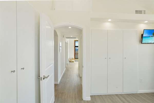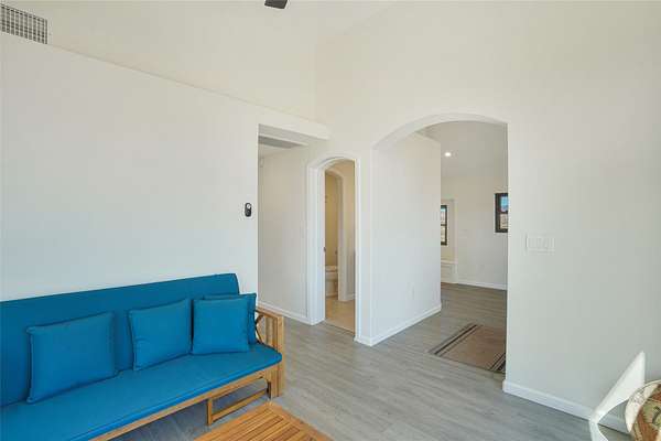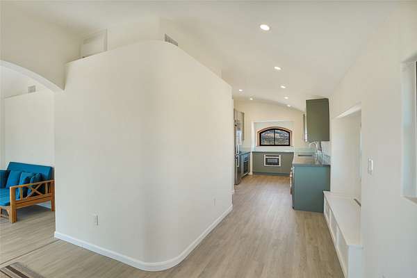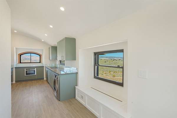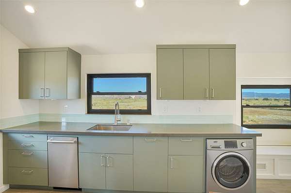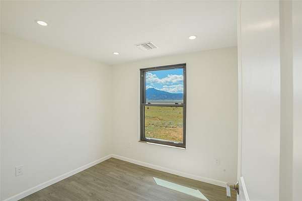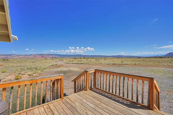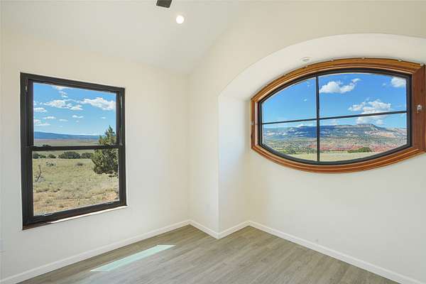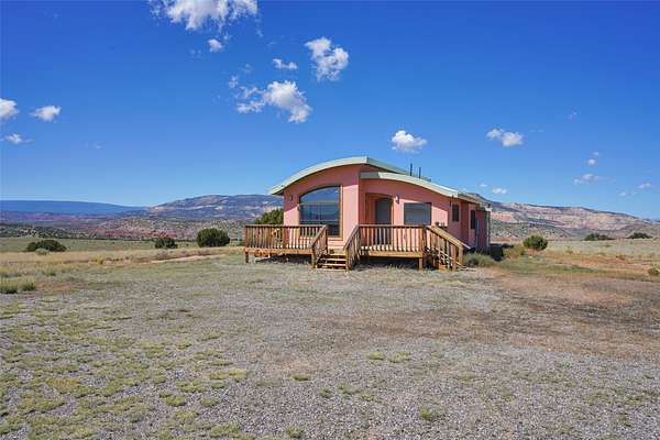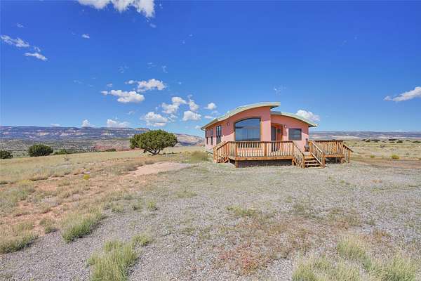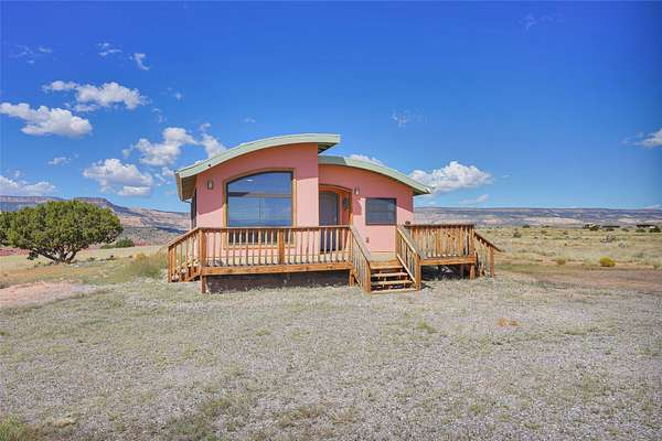 199 Private Drive 1728 in Youngsville sits on five acres with access to a private boat ramp and recreation area on Abiquiu Lake. Behind a motorized gate, the property offers both privacy and convenience. The 768-square-foot home, completed in 2020, was designed around the idea of efficient living. High ceilings, clerestory windows, and rounded corners create an easy flow through two bedrooms, a full kitchen, dining nook, living area, and three-quarter bath. Energy-efficient windows and appliances, mini-split heating and cooling, and smart-home features are already in place. The home is tied to the grid, and the solar array helps offset electric costs, with the option to add battery backup if desired. Low-flow fixtures, low or no-VOC finishes, and fire-resistant siding contribute to its durability and efficiency. The property is served by a shared well with a reverse osmosis system and a conventional septic system. From the house, the views reach across Ghost Ranch, Cerro Pedernal, and Mesa Prieta-landscapes that define northern New Mexico. With gated entry, lake access, and a home designed for efficiency, this property offers a comfortable balance between setting and design.