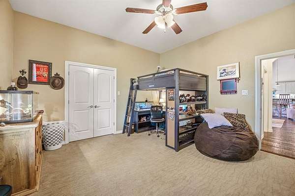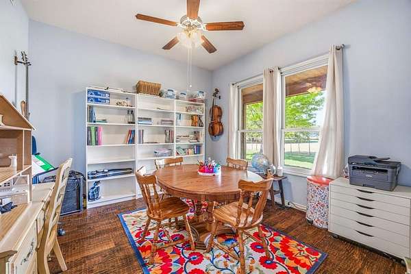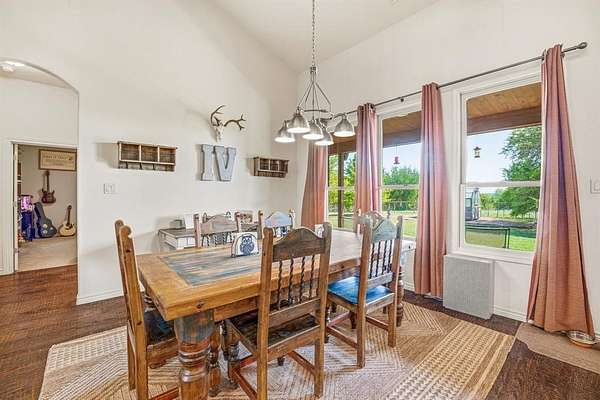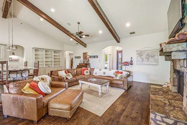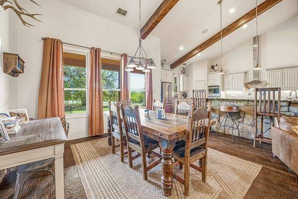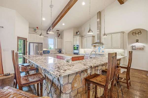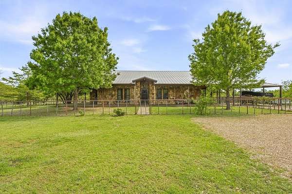 Escape to true Texas country living with this stunning secluded stone home, tucked away in the middle of wide-open ranch land where peace and privacy take center stage. This 4-bedroom, 3-bathroom home offers the perfect blend of rustic charm and modern comfort, surrounded by breathtaking views and abundant wildlife you can enjoy from the expansive wraparound porch that extends to the back patio. Step inside to an open-concept layout filled with natural light, featuring high-end exposed beams, rich dark hardwood floors, and a striking gas stone fireplace that anchors the living space. The kitchen is built for gathering with granite countertops, a large L-shaped granite and stone bar with seating for up to eight, an additional butcher block island, gas stovetop, double ovens, pantry, and ample storage throughout. The split-bedroom design ensures privacy, with large rooms for family or guests. The primary suite is a true retreat with a spacious layout and ensuite bathroom featuring a double vanity, stand-alone shower, and garden tub. Just off the master is a secure safe room and additional office space, perfect for working from home. The laundry room also offers great storage. Outside, enjoy a fenced backyard with mature trees, a greenhouse, chicken coop, and covered stall pens, ideal for country living. The extended back patio provides space for relaxing or entertaining. A two-car attached carport plus additional covered parking gives plenty of room for vehicles and equipment. A long private driveway leads to a circular drive centered around a beautiful live oak over 100 years old, creating a stunning and welcoming first impression. This property offers unmatched tranquility, space, and the freedom of ranch living.