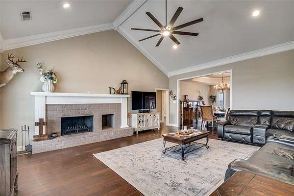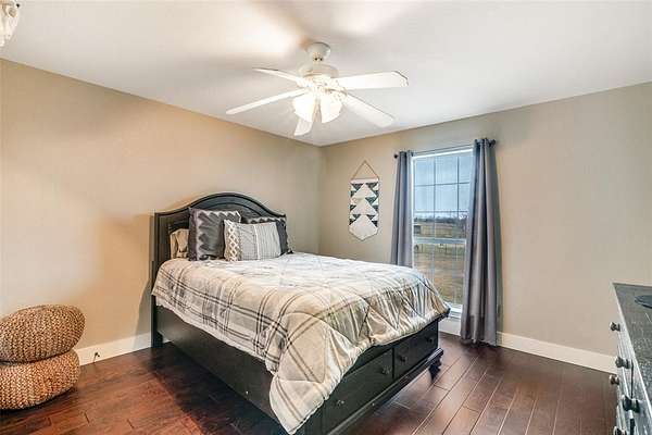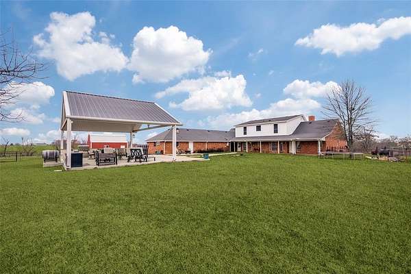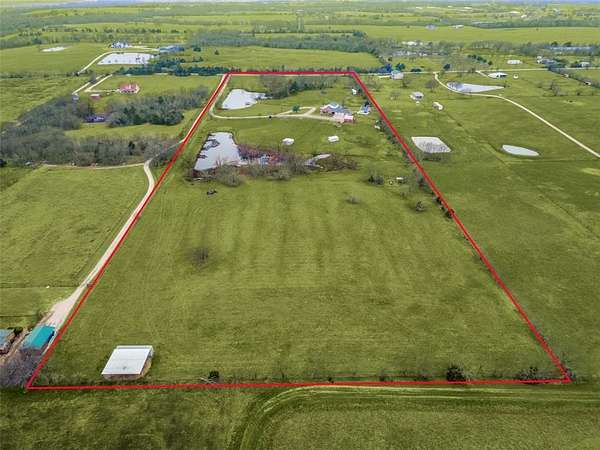 Stunningly updated traditional home set on 20+ secluded acres behind an electric gate. Beautiful oak, pecan and pear trees overlook two stocked ponds and wide-open countryside views. The home features gorgeous engineered hardwood flooring, updated bathrooms, and an updated kitchen with quartz countertops. The living room features vaulted ceilings and a wood-burning fireplace. The spacious downstairs primary suite comes with and an adjacent private flex space, perfect for a study or nursery. Split downstairs guest suite includes a second living area, ideal for multigenerational living or guests. Upstairs offers three additional bedrooms and a full bath. Enjoy the brand new outdoor living space boasting an outdoor kitchen that includes a Blaze grill, perfect for all your gatherings. The property is fully fenced and cross-fenced with a majority of the fencing being pipe fence, and features a pipe round pen, perfectly set up for horses. With an irrigation well, Ag exemption, and excellent infrastructure for country living, this property is turn key and ready. Improvements include a barn, loafing sheds, fourth garage, workshop space, ATV parking, and RV hookup. A rare opportunity for privacy, functionality, and beautifully improved living space on expansive acreage.