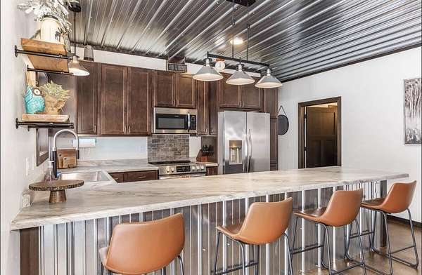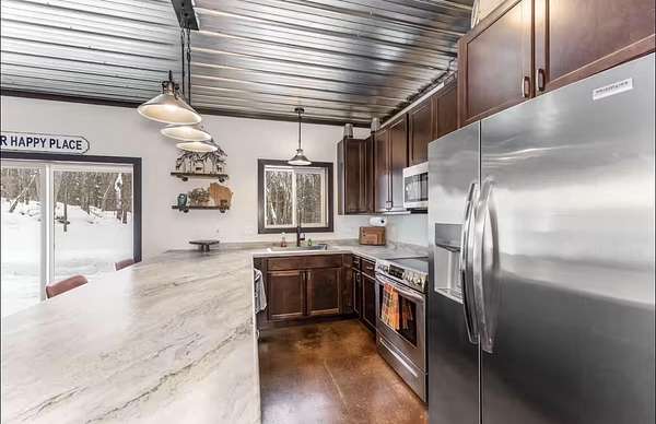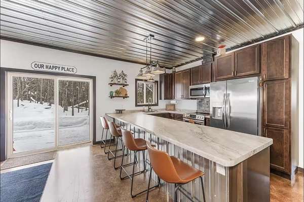 Welcome to your Northwoods escape in Phelps- where lake access, privacy, & year-round adventure meet modern luxury. Situated on 5 private ac, this NEW BUILD 3-bed, 2-bath TURNKEY home offers the perfect blend of refined comfort & outdoor lifestyle. Enjoy lake access just moments away, then head straight from your own backyard onto the trails by snowmobile or ATV- true four-season recreation right at your doorstep. Inside, the open-concept layout was designed for gathering and entertaining, with expansive living & dining areas that flow seamlessly onto a beautiful patio- ideal for summer evenings surrounded by towering trees & peaceful Northwoods scenery. Brand-new appliances, in-floor heat, & thoughtfully curated finishes create warm, high-end vibes throughout. The attached heated garage adds convenience, while the new in-house generator & mound system provide comfort & peace of mind. A striking exterior rock wall enhances the home's natural, upscale aesthetic & welcoming curb appeal.