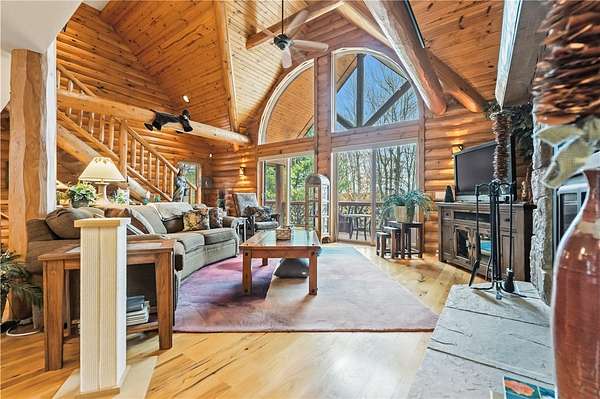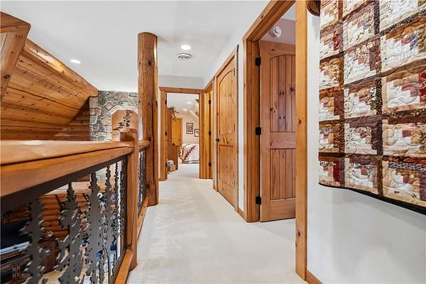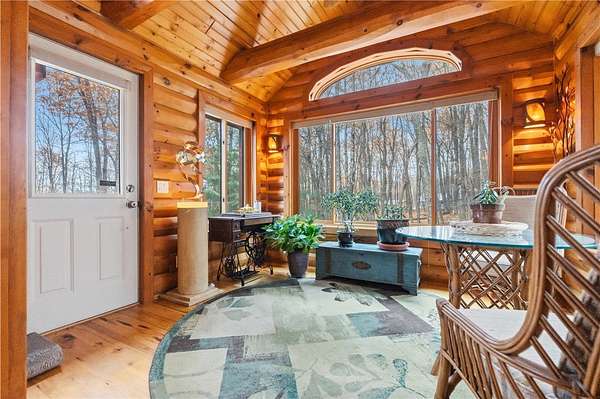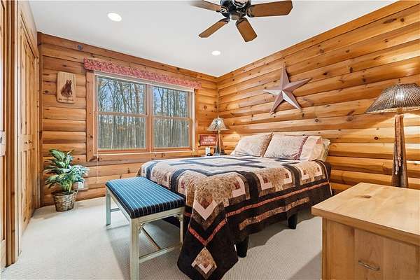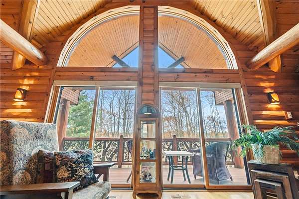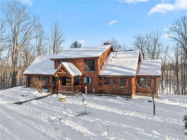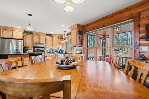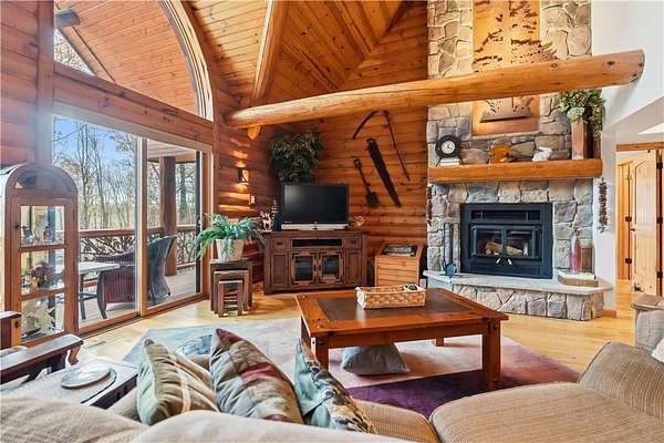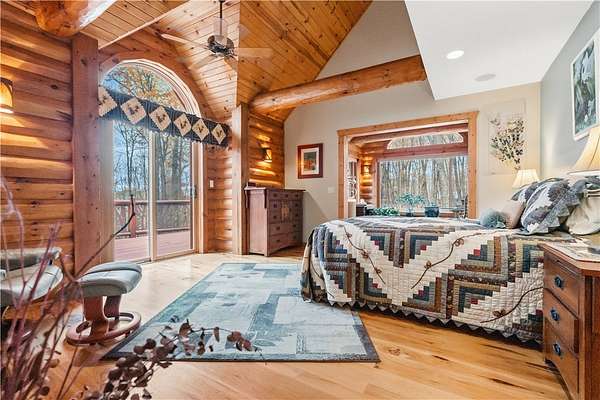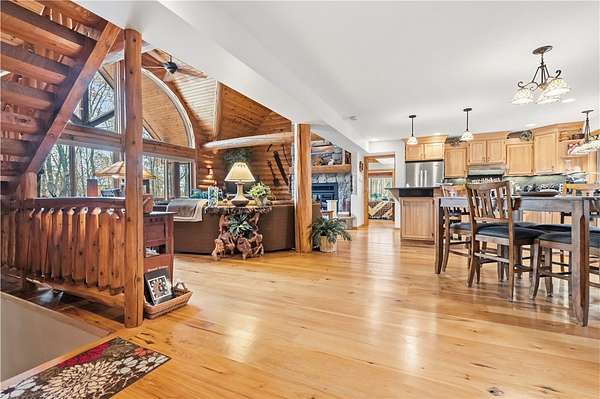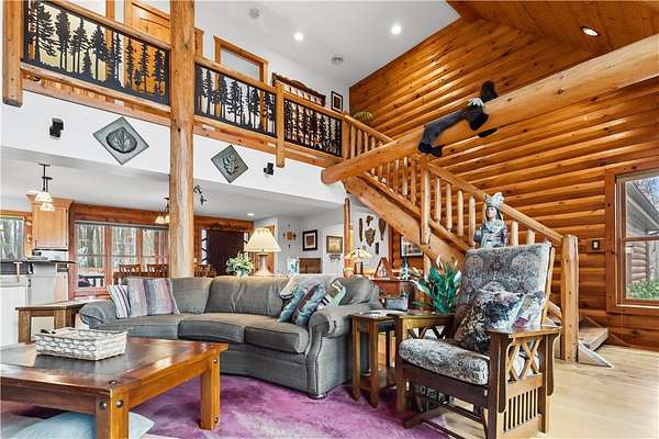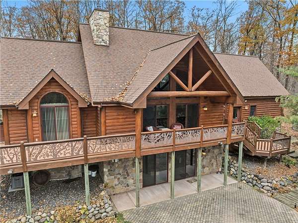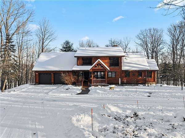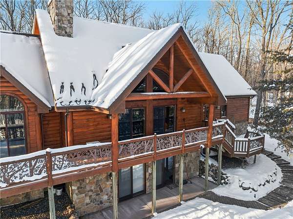 Discover your private sanctuary in this stunning log-sided home, where rustic charm meets luxurious living. Tucked away on a beautifully landscaped 3.4-acre lot with over 240 feet of serene Chippewa River frontage, this property offers a perfect blend of tranquility and high-end features. From the moment you arrive on the blacktop driveway, you'll be captivated by the home's exceptional craftsmanship. Step through the magnificent, custom-carved wooden eagle front door into a breathtaking open-concept living space designed for both grand entertaining and quiet relaxation. The main floor features an inviting open layout, anchored by a gorgeous stone wood-burning fireplace that creates a warm and welcoming atmosphere for family and guests. A chef's dream, the kitchen features beautiful wood cabinets, elegant Cambria countertops, and a full suite of premium appliances. It is perfectly situated for seamless entertaining and everyday meals. Your personal oasis awaits on the main level. The primary en suite boasts a private balcony overlooking the river, a cozy sun room for all-season enjoyment, and a spa-like bathroom featuring a tiled walk-in shower, double sinks, and a spacious walk-in closet. The upper level features two comfortable bedrooms and a full bathroom, offering a private space for family or guests. Unmatched Outdoor Living: With over 240 feet of riverfrontage, your backyard is a gateway to Northwood's adventure. Enjoy fishing, swimming, kayaking, or simply relaxing by the water's edge. Escape to a lifestyle of comfort, luxury, and natural beauty. This riverfront retreat is a rare opportunity to own a piece of paradise.