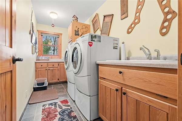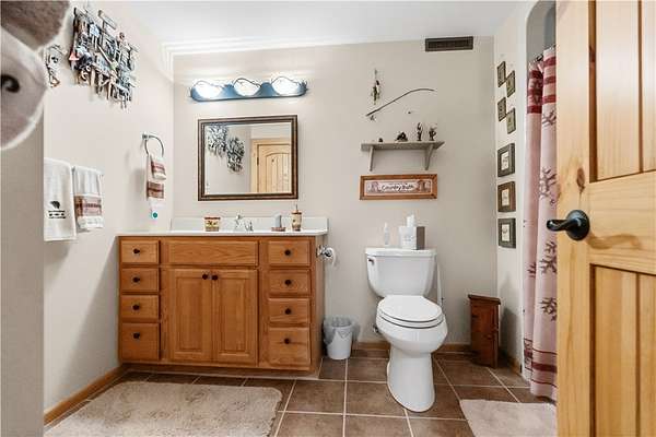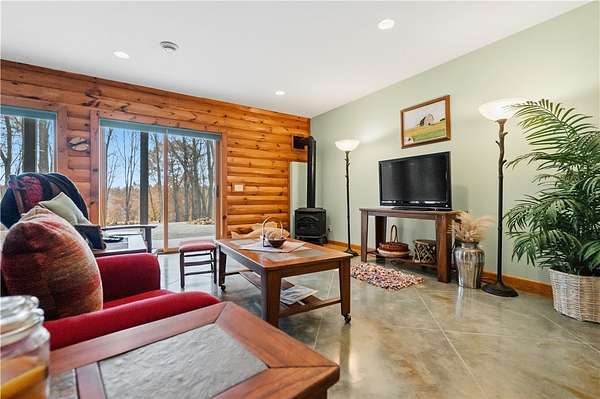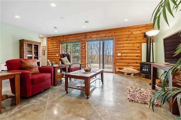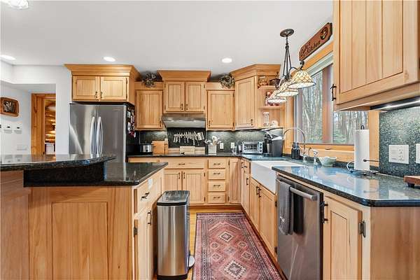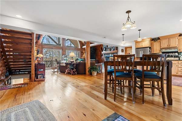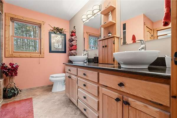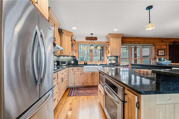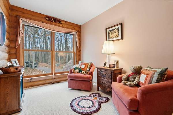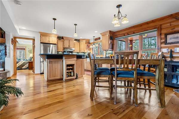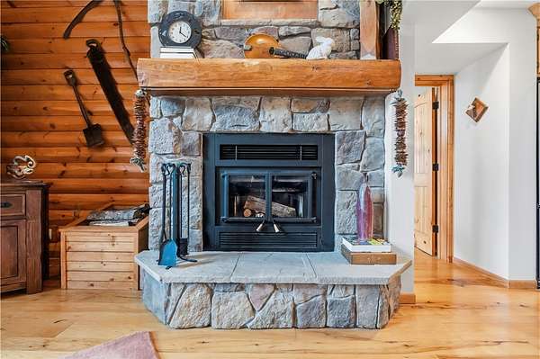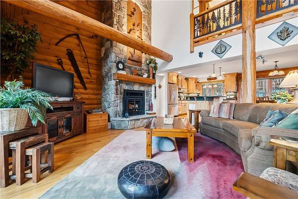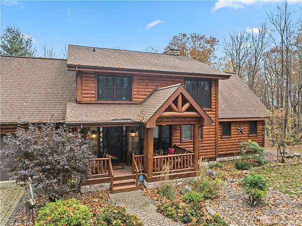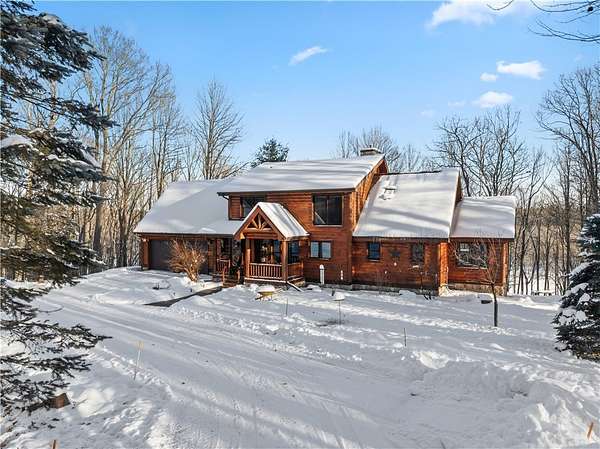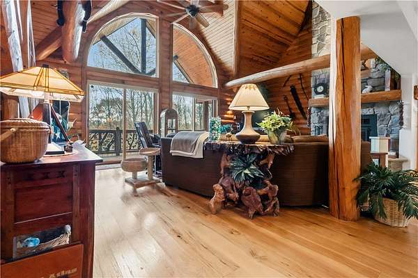 Discover your private sanctuary in this stunning log-sided home, where rustic charm meets luxurious living. Tucked away on a beautifully landscaped 3.4-acre lot with over 240 feet of serene Chippewa River frontage, this property offers a perfect blend of tranquility and high-end features. From the moment you arrive on the blacktop driveway, you'll be captivated by the home's exceptional craftsmanship. Step through the magnificent, custom-carved wooden eagle front door into a breathtaking open-concept living space designed for both grand entertaining and quiet relaxation. The main floor features an inviting open layout, anchored by a gorgeous stone wood-burning fireplace that creates a warm and welcoming atmosphere for family and guests. A chef's dream, the kitchen features beautiful wood cabinets, elegant Cambria countertops, and a full suite of premium appliances. It is perfectly situated for seamless entertaining and everyday meals. Your personal oasis awaits on the main level. The primary en suite boasts a private balcony overlooking the river, a cozy sun room for all-season enjoyment, and a spa-like bathroom featuring a tiled walk-in shower, double sinks, and a spacious walk-in closet. The upper level features two comfortable bedrooms and a full bathroom, offering a private space for family or guests. Unmatched Outdoor Living: With over 240 feet of riverfrontage, your backyard is a gateway to Northwood's adventure. Enjoy fishing, swimming, kayaking, or simply relaxing by the water's edge. Escape to a lifestyle of comfort, luxury, and natural beauty. This riverfront retreat is a rare opportunity to own a piece of paradise.
