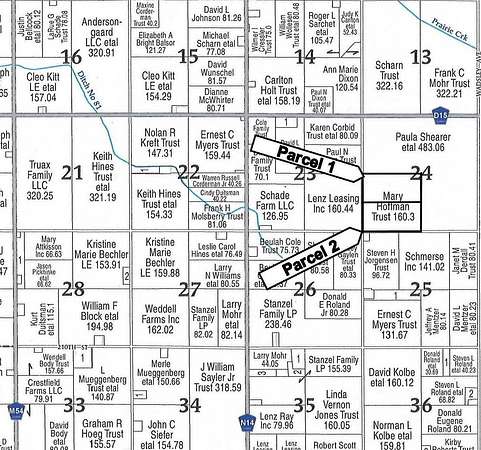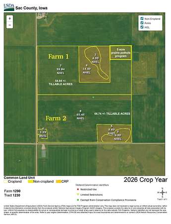 BRIEF LEGAL DESCRIPTIONS FARM 1: N1/2 SW1/4, Section 24, T89N, R35W 5th P.M., Sac County; FARM2 : S1/2 SW1/4, Section 24, T89N, R35W 5th P.M., Sac County, Iowa. (Douglas Township) GENERAL DESCRIPTION & METHOD OF SALE 156 Net taxable acres of highly productive, well located Sac County, Iowa farmland: FARM 1: North 79 net taxable acres with a CSR2 on tillable acres of 86.1 Sales price will be high bid times 79. Farm 1 has approximately 54.84 tillable acres 19.3 currently enrolled in CRP program paying $300/acre. Farm 1 also 5 acres enrolled in a Prairie Pothole program with the Sac County NRCS office that is paying $381.55/Acre and expires on December 31, 2027. FARM 2: A 77 net taxable acres w/ CSR2 on tillable acres of 87.2. Sales price will be high bid times 77. Farm 2 has approximately 66.74 tillable acres and 10.5 acres enrolled in CRP program paying $300/acre. CRP contract on both farms expires on September 30, 2031. FSA DATA (whole farm): 155.09 cropland acres with 125.29 effective cropland acres. The corn base is 62.65 acres with a PLC yield index of 163. The soybean base is 62.64 acres with a PLC yield index of 45. The whole farm has 29.8 acres enrolled in CRP program paying $300/acre and expires on September 30, 2031. The Seller will assign their right to the CRP contract and Buyer agrees to enter into a successor in interest agreement to the CRP contract The current real estate taxes amount to: Farm 1: $2,698/yr; Farm 2: $2,640/yr; The high successful bidder will have choice of Farm 1 or Farm 2, in the event the high bidder selects both Farms the sale is over. If the high bidder selects 1 farm, it will be marked as sold with the remaining Farm being sold. They will not be recombined or reoffered in any way. TERMS OF SALE Purchaser(s) will be expected to pay 10% of the purchase price on day of sale and sign a standard real estate contract agreeing to pay the balance in full on or before March 15, 2026. Possession will be given upon closing. There are no Buyer contingencies of any kind. All potential bidders are expected to have financial arrangements made prior to bidding. Auctioneers represent the Sellers in this real estate auction. The property is being sold as-is, where-is. Any announcements made day of sale will supersede any advertising.