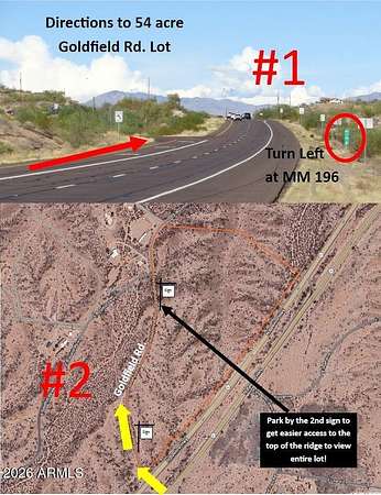 Take HGWY 87 from Shea Blvd. to mile marker 196 turn left and cross the median onto Goldfield Road. Lot is on right look for one of the two signs. Take flyer for additional directions.