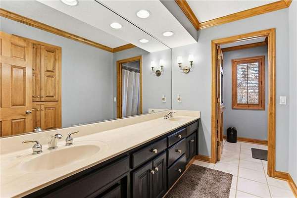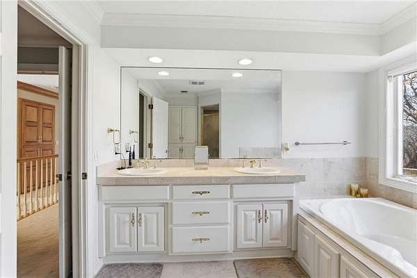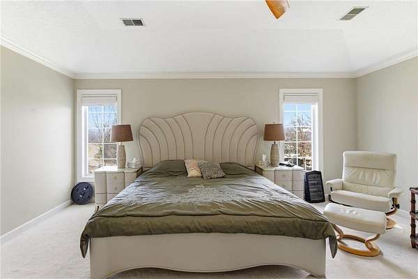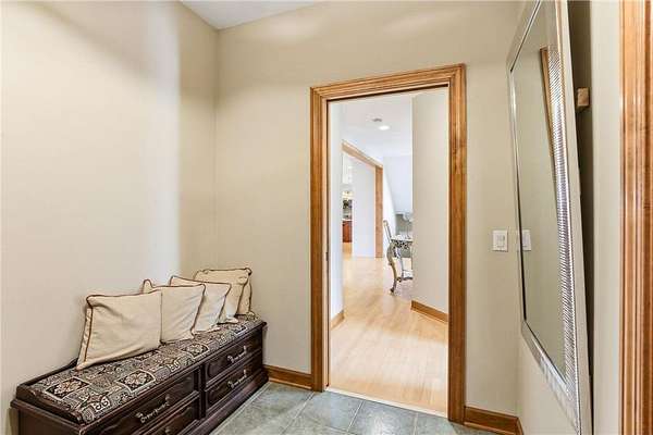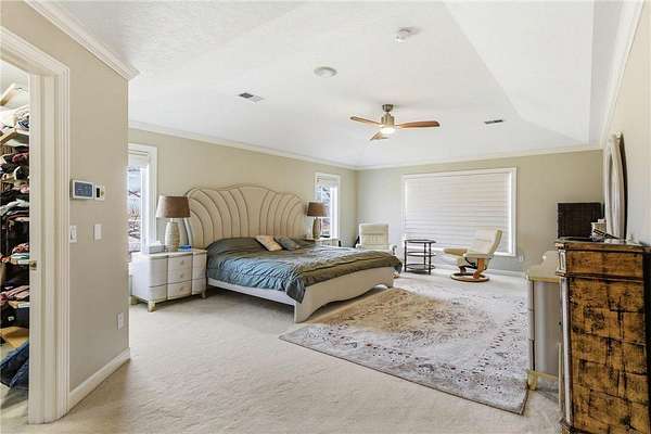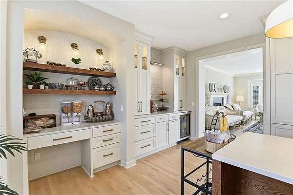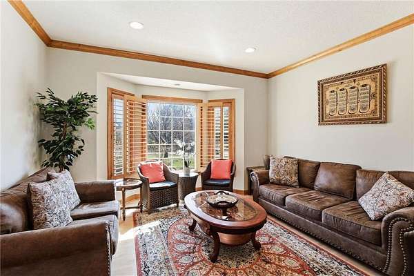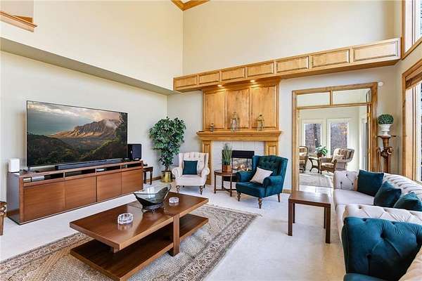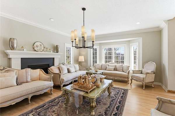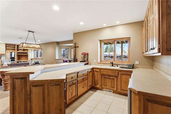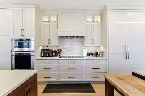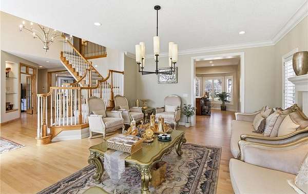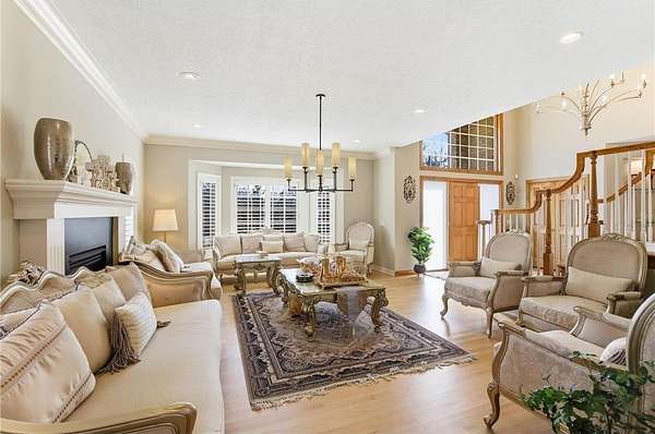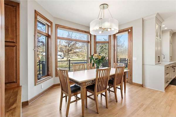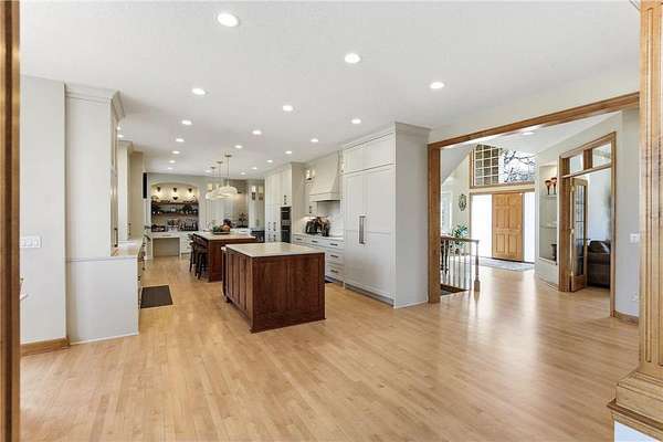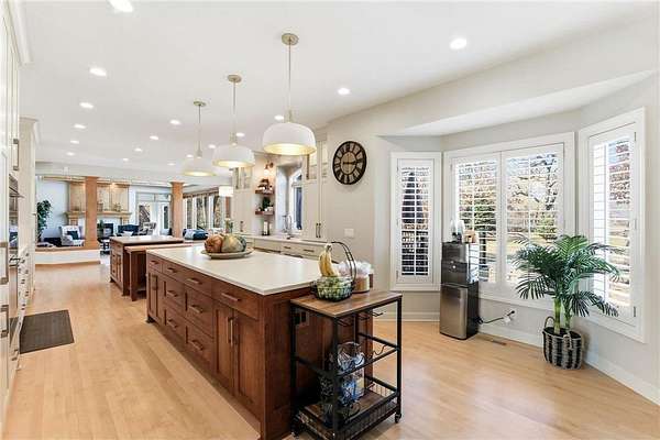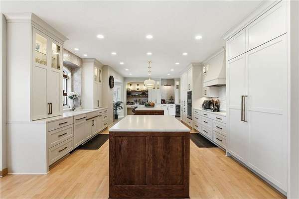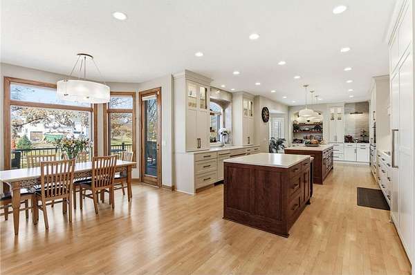A major remodel by Michels Homes features a formal dining room with gas fireplace, gourmet kitchen with dual islands, beverage station & workstation, and informal dining that walks out to a maintenance-free deck. The two-story great room with a two-way gas fireplace opens to a sunroom with heated floors overlooking the backyard.