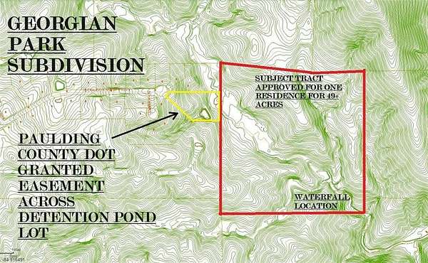 WATERFALL WATERFALL WATERFALL! Once in a LIFETIME opportunity to own your PERSONAL WATERFALL! This historic 49 Acre tract has come available and is truly an incredible land tract. If you are looking for your own private reserve for hunting, ATV riding, exploration or the place to build your own retreat this is the SPOT! My client negotiated access to this tract through the Georgian Park Community in West Paulding County with the Paulding County Board of Commissioners and effectively saved a truly incredible property. Many locals have heard of the Mulberry Rock Waterfall but until now the property was all but inaccessible, tucked in between large land owners this tract was in danger of being landlocked and lost to time but through exhaustive efforts and negotiations the county agreed to allow an ingress/egress easement across the lot that was deeded to the county to maintain the neighborhood detention pond. My client has cleared a road and built a bridge to cross the headwaters of the Little Pumpkinvine Creek which winds across this tract of mature pines and hardwood bottoms and ends at the waterfall. The county agreed to this permanent access on the condition that only one home could be built on the property! Less than 45 minutes from downtown Atlanta this special property is waiting on the special owner! Call today to schedule a private tour on the listing agent's Utility Vehicle and see one of the most incredible land tracts in all of West Georgia!