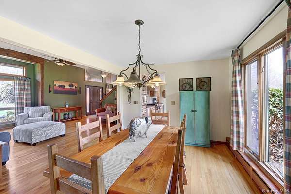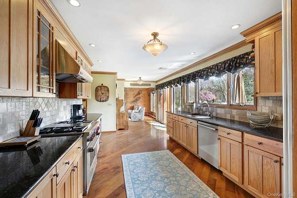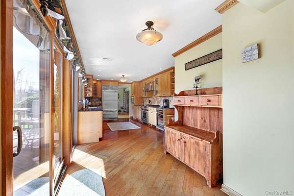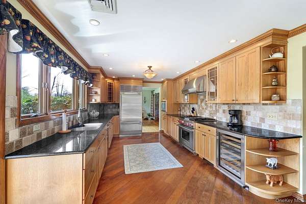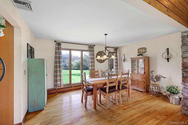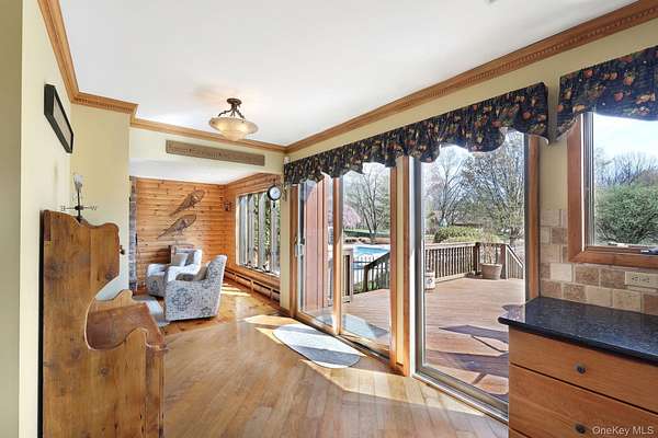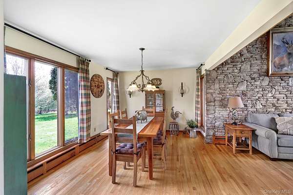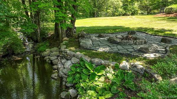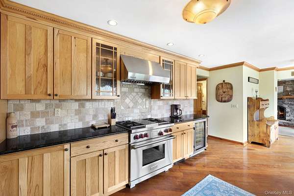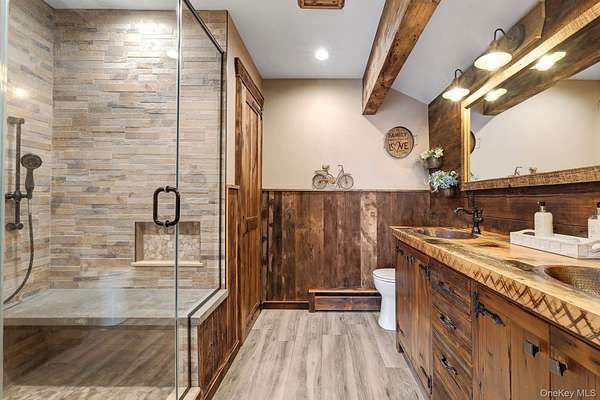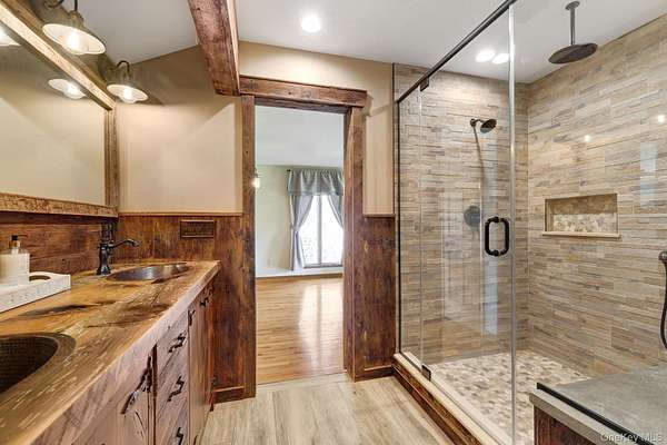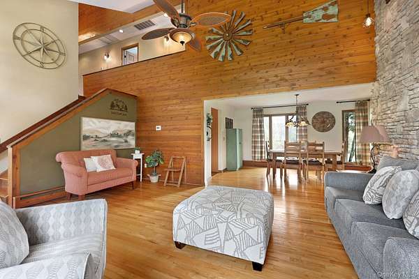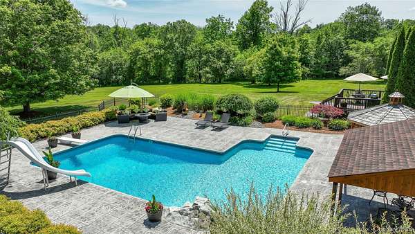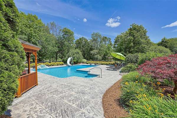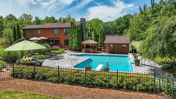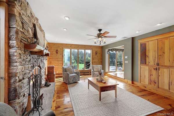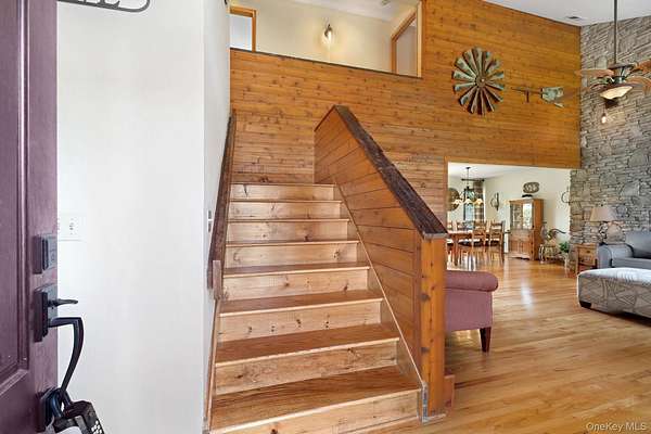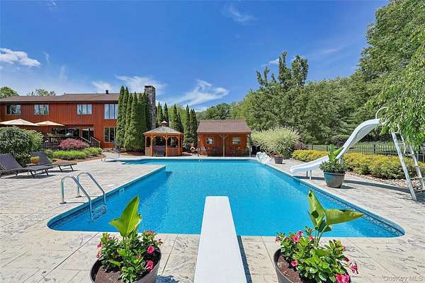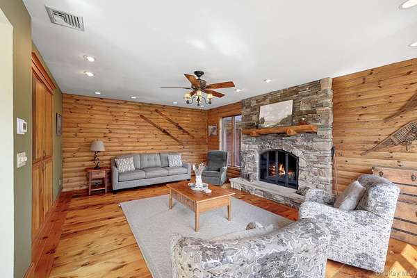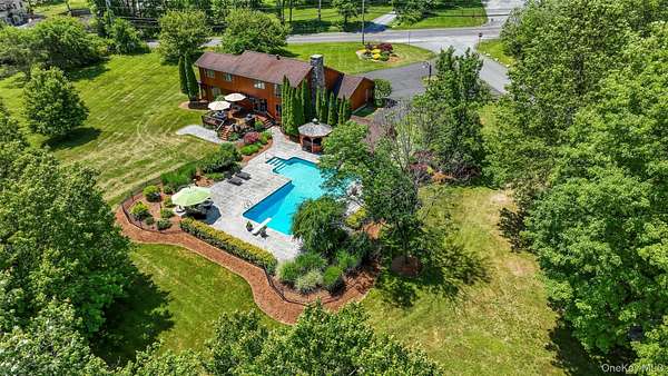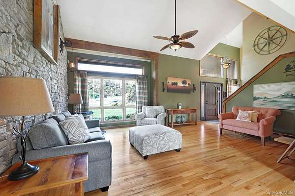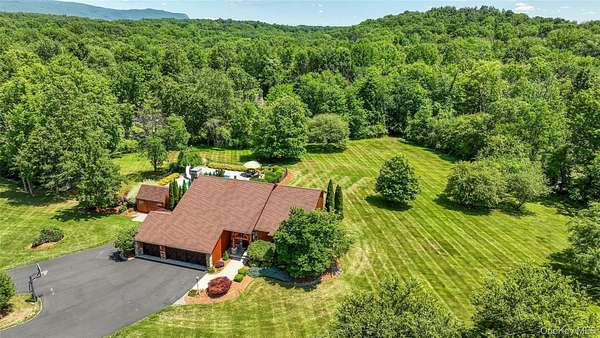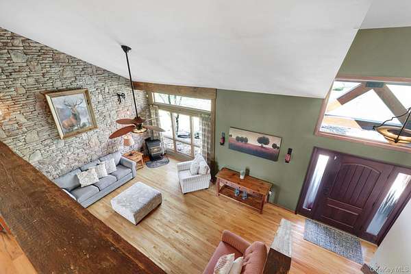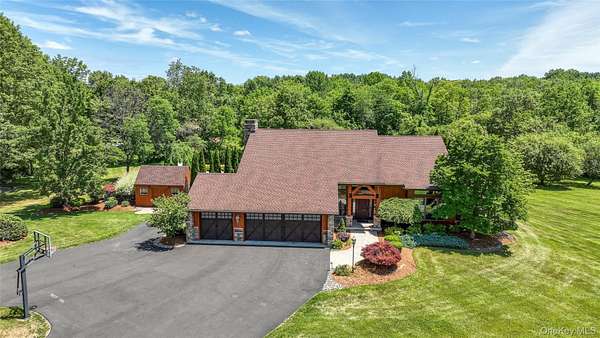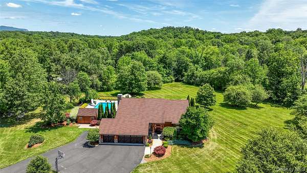 This exceptional three-bedroom residence seamlessly blends contemporary elegance with the warmth of a refined log home aesthetic; it has been meticulously maintained and thoughtfully curated throughout. Privately set on 2 picturesque acres, bordered by a tranquil stream, the property features professional landscaping and striking paver walkways leading to a grand front entrance framed by custom stone pillars-offering a truly impressive first impression. Step inside to a dramatic foyer that opens to a breathtaking living room, where soaring vaulted ceilings and a floor-to-ceiling custom stone feature wall create a stunning focal point. A pellet stove adds both ambiance and comfort, perfect for cozy winter evenings. The space flows effortlessly into an elegant dining area, ideal for both intimate gatherings and entertaining on a larger scale. Expansive windows throughout the home bathe each room in natural light, creating a bright and inviting atmosphere. The chef's kitchen is a showpiece, appointed with premium appliances including a Wolf gas range, Sub-Zero refrigerator, wine cooler, double dishwasher, granite countertops, a stone backsplash, and abundant custom cabinetry. Sliding glass doors lead to an expansive rear deck overlooking a resort-style outdoor oasis designed for ultimate enjoyment. The sunken "log room" exudes rustic sophistication with rich barnwood flooring, a gas fireplace with a stone surround, and a custom wood mantel-offering a warm and inviting retreat. A well-appointed laundry room and stylish powder room complete the main level. Upstairs, custom barnwood railings guide you to an open balcony overlooking the main living space. Hardwood flooring continues throughout, complemented by dimmable lighting and a beautifully finished full bath. The flexible layout offers 3 bedrooms, including a spacious primary suite featuring dual closets, an additional expansive walk-in closet and a spa-like ensuite with a custom barnwood sliding door, an exquisite walk-in shower, porcelain tile flooring, and a handcrafted vanity. The lower level provides additional potential for storage, recreation, or future living space. Outdoors, the property transforms into a private resort. Bluestone pavers lead to a heated, L-shaped in-ground pool complete with a slide and diving board, surrounded by stamped concrete and lush landscaping. Enjoy year-round entertaining with a hot tub beneath a charming gazebo, multiple fire pit areas, and an integrated outdoor sound system-all designed to elevate your lifestyle. Additional highlights include central air with WiFi-enabled thermostats, a heated three-car garage with attic storage, and an extensive list of recent upgrades ensuring true move-in luxury. Perfectly positioned just minutes from town while offering easy access to the region's premier destinations-including local wineries, breweries, outdoor recreation, and world-class attractions; Angry Orchard, Sam's Point, Minnewaska State Park, Mohonk, Legoland, The Kartrite Resort & Indoor Water Park, Resorts Word Catskill Casino, Bethel Woods and more! This remarkable property delivers an unparalleled blend of privacy, sophistication, and modern convenience. Pine Bush School District