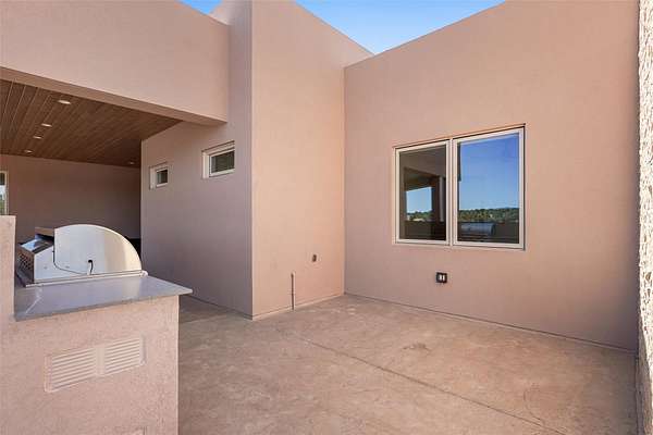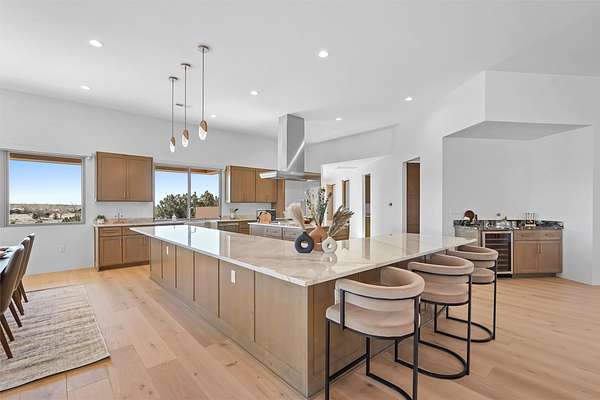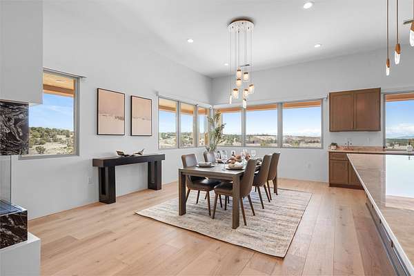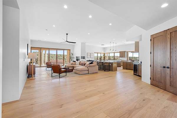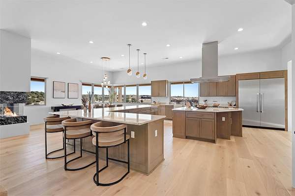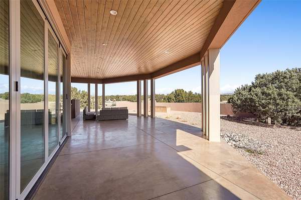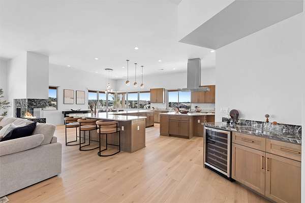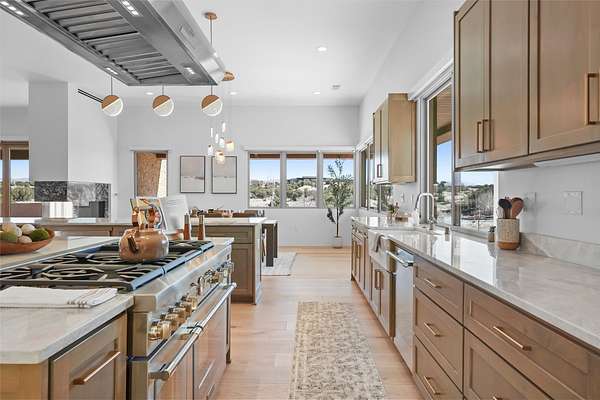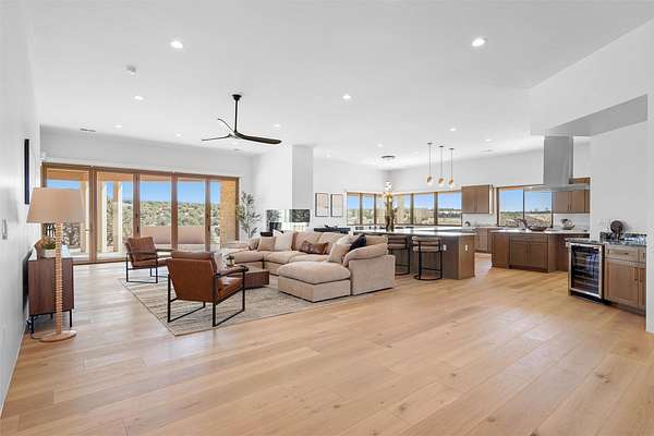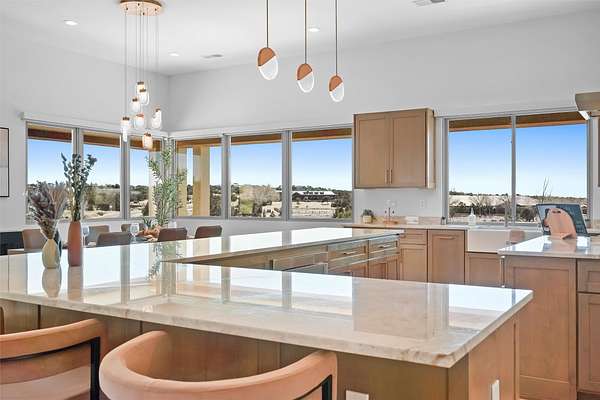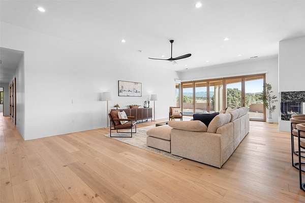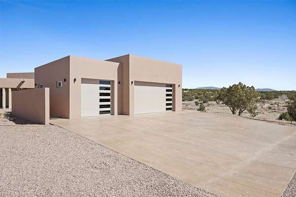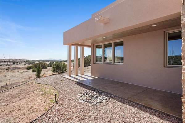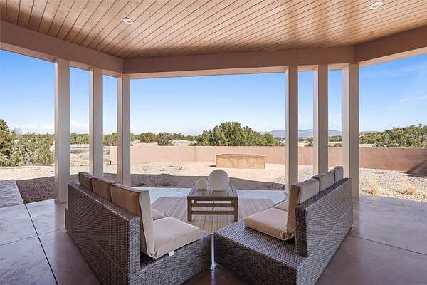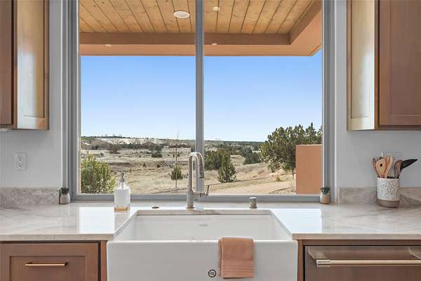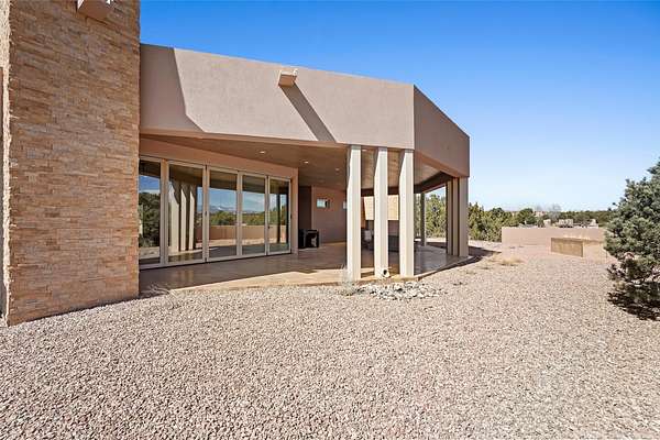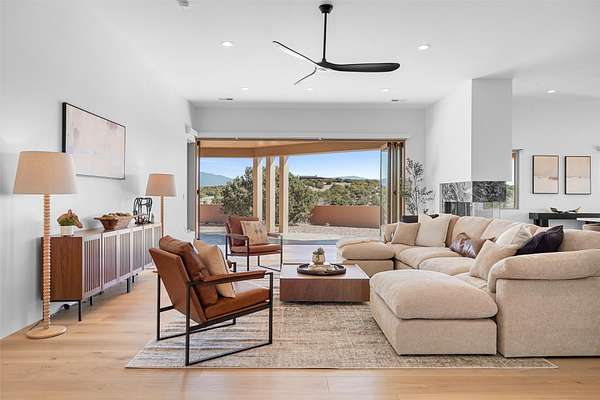Completed in late 2025 and set on 2 acres in Las Campanas, this single level residence captures expansive views of the Sangre de Cristo Mountains and the nearby equestrian center. Built by Contreras Construction, a respected local builder known for integrity, the home reflects planning and attention to detail throughout. This home offers 4,209 square feet with three bedrooms, five bathrooms, a dedicated office, and a three-car garage with epoxy-coated flooring. The main living and dining spaces are centered around a two-way fireplace that creates a natural focal point for gathering. The kitchen features Thermador appliances, quartzite countertops, and a butler's pantry that provides additional storage and preparation space. Folding glass doors open the main living area to the outdoor patio, allowing the interior spaces to flow easily outside. The primary suite includes a fireplace and spacious bathroom including a soaking tub, rain shower, Toto bidet toilet, and porcelain tile finishes. Closet pull-downs and built-in storage elements provide practical organization throughout the home. Outdoor living areas were designed to take advantage of the surrounding views. The patio includes a built-in gas grill, mini refrigerator, and fire pit positioned for enjoying the mountain setting and open sky. Located within the gated Las Campanas community, this property offers privacy, quiet surroundings, and convenient access to Santa Fe's dining, galleries, and cultural destinations.