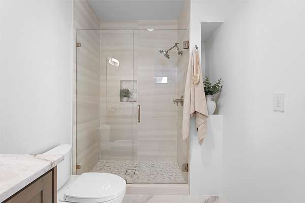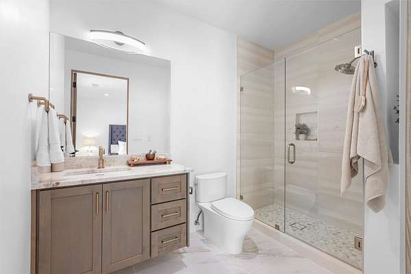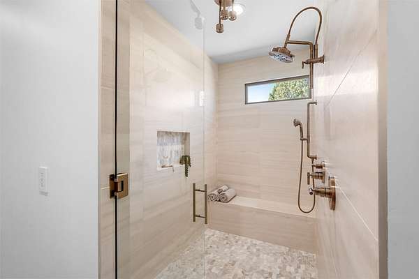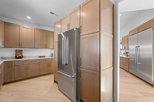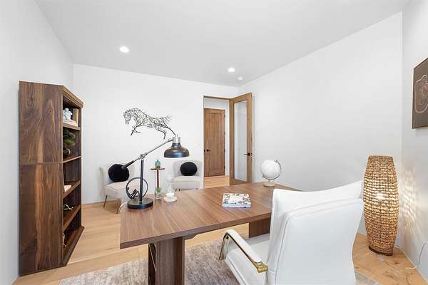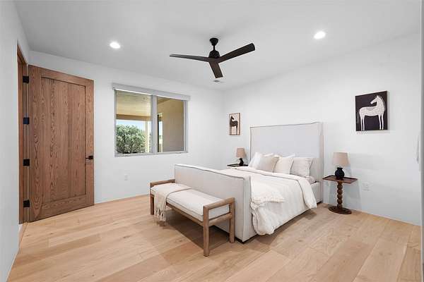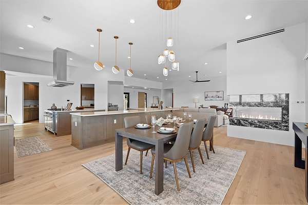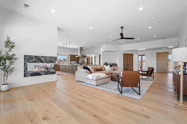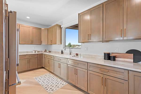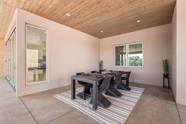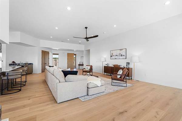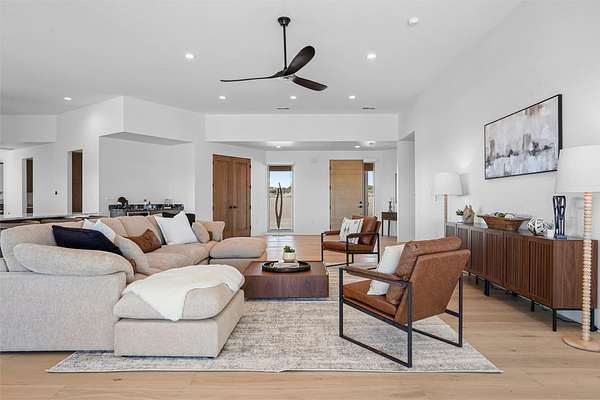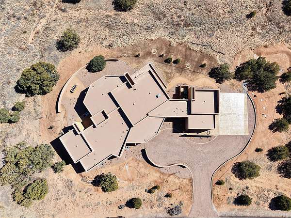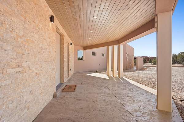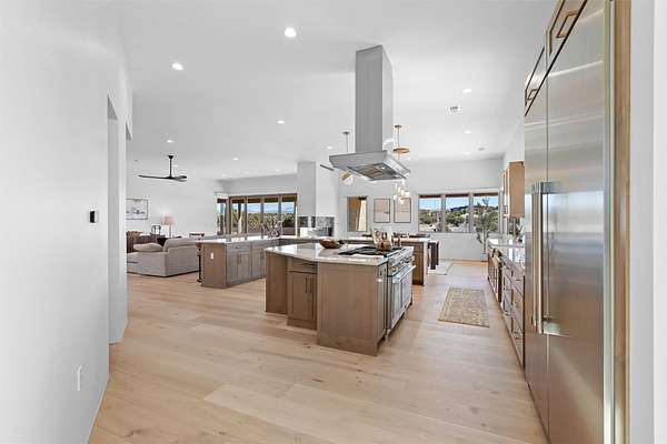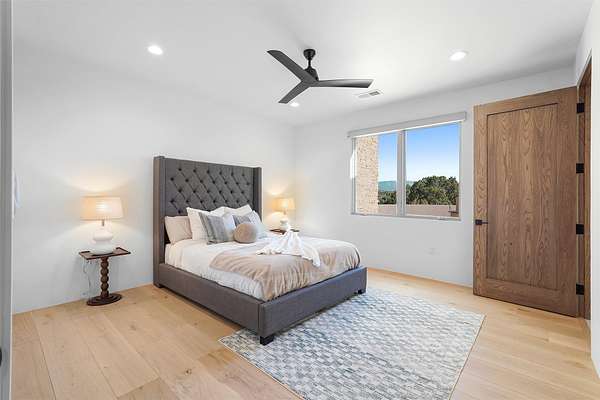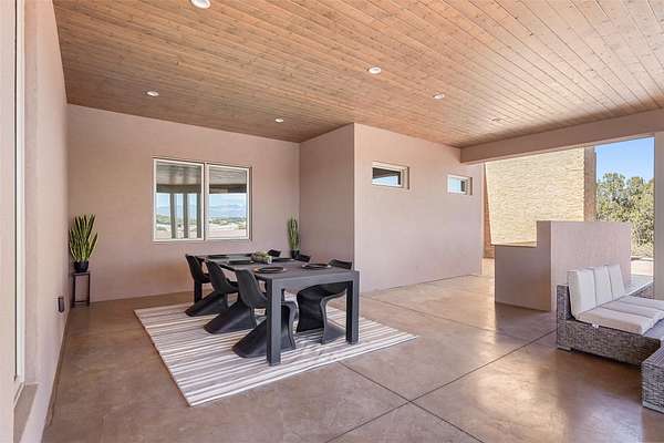 Completed in late 2025 and set on 2 acres in Las Campanas, this single level residence captures expansive views of the Sangre de Cristo Mountains and the nearby equestrian center. Built by Contreras Construction, a respected local builder known for integrity, the home reflects planning and attention to detail throughout. This home offers 4,209 square feet with three bedrooms, five bathrooms, a dedicated office, and a three-car garage with epoxy-coated flooring. The main living and dining spaces are centered around a two-way fireplace that creates a natural focal point for gathering. The kitchen features Thermador appliances, quartzite countertops, and a butler's pantry that provides additional storage and preparation space. Folding glass doors open the main living area to the outdoor patio, allowing the interior spaces to flow easily outside. The primary suite includes a fireplace and spacious bathroom including a soaking tub, rain shower, Toto bidet toilet, and porcelain tile finishes. Closet pull-downs and built-in storage elements provide practical organization throughout the home. Outdoor living areas were designed to take advantage of the surrounding views. The patio includes a built-in gas grill, mini refrigerator, and fire pit positioned for enjoying the mountain setting and open sky. Located within the gated Las Campanas community, this property offers privacy, quiet surroundings, and convenient access to Santa Fe's dining, galleries, and cultural destinations.