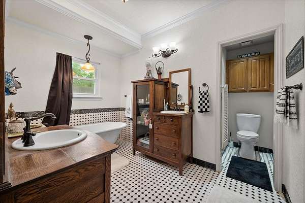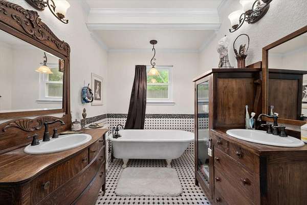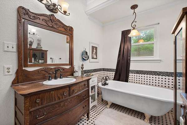 The home offers two bedrooms, two and a half baths, and a loft that serves as a flexible third bedroom, with hardwood floors throughout the main living areas. The primary suite is a room that earns its keep. A cast iron wood burning stove anchors one wall, black and white hex tile runs underfoot in the bath, and a clawfoot tub holds court between two vanities that began their lives as antique dressers. It is the kind of bathroom that makes you rearrange your morning.