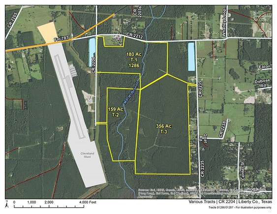 Est $9,759/moCleveland development/recreation tract adjoining the Cleveland Municipal Airport. Good access fronting CR 2204 and CR 2212. Very close to FM 787 and minutes to US 59. Heavily wooded in pine plantations with hardwood along creek drain. 1st time open market offering !