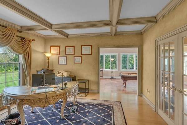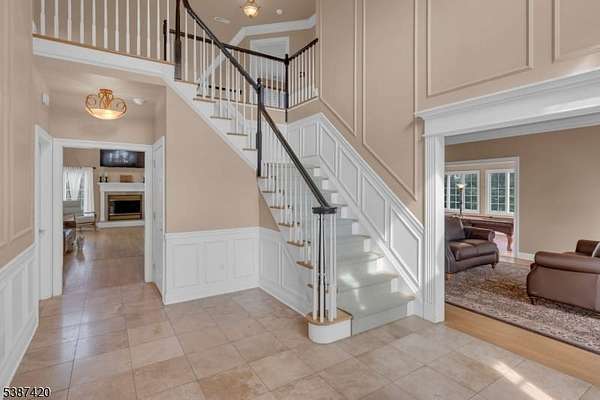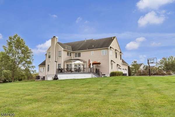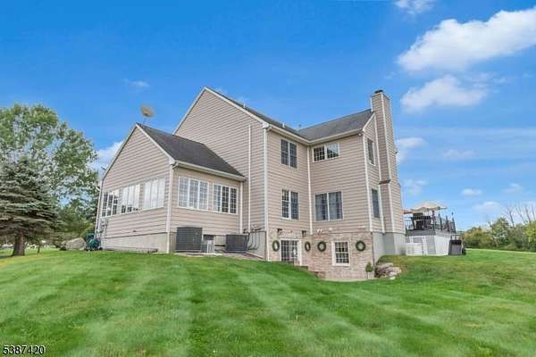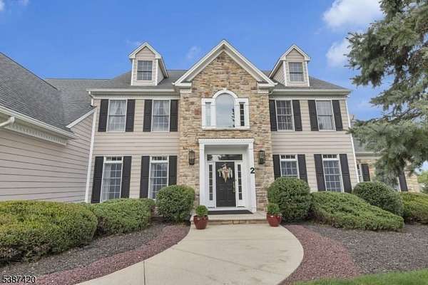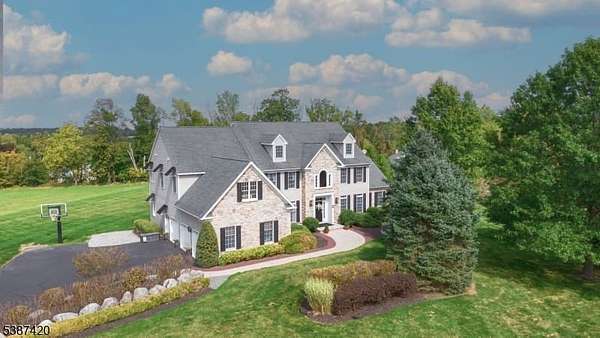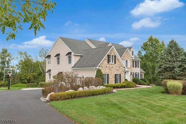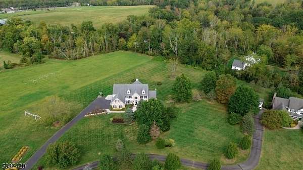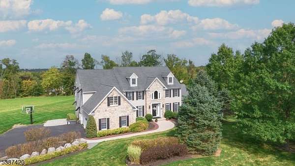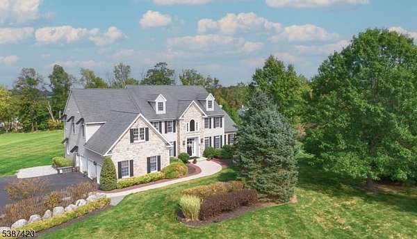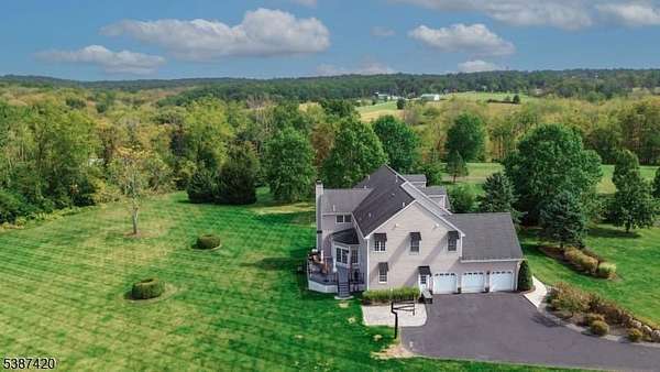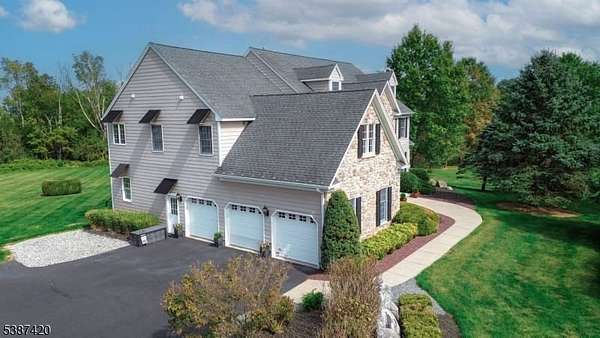 Tucked into a quiet cul-de-sac just minutes from Lambertville, New Hope & the natural beauty of the Sourland Mountains, this elegant, stone-front estate was custom-built by Sebastiano Nini in 2004 & has been maintained by its original owner. One of only two homes built to this unique blueprint, this residence blends timeless craftsmanship w/ thoughtful high-performance design. Sited on 2.65 open scenic acres that border protected farmland, the property offers a tranquil, wildlife-rich setting bordering the Hills of Hunterdon. There is no HOA or restrictions, a rare find in a premium location.Inside, the home offers nearly 6,000 sq ft of finished living space, plus a 600 sq ft stand-up attic & a three-car garage. Throughout the 1st & 2nd, you'll find all hard surface flooring, extensive custom trimwork & vaulted ceilings in the great room, sunroom, primary bedroom & primary bathroom.The foyer, powder room & walkout basement area are all finished w/beautiful travertine tile, setting the tone for refined finishes & quality materials used throughout. With over 40 windows, the home is filled w/natural light in every season.The great room w/ gas fireplace anchors main living space w/warmth & scale, while a formal dining room, living room, private study & sunroom/conservatory complete the main level. A mechanical chandelier lift in the foyer allows for easy cleaning of the statement fixture.A truly unique offering w/timeless appeal & modern convenience. Easy commute to NYC & Philly