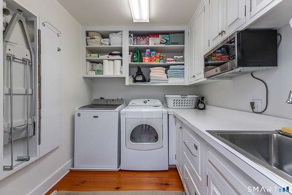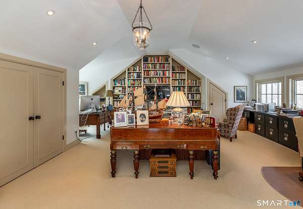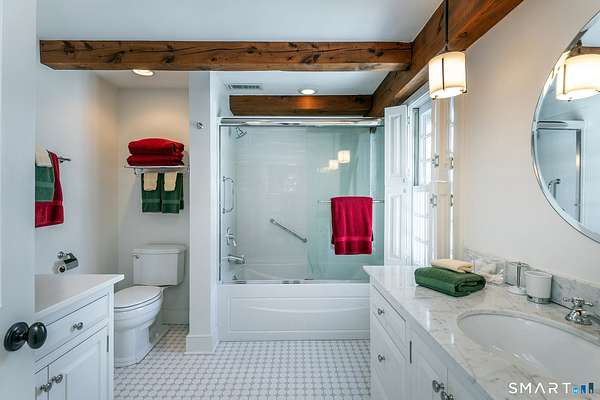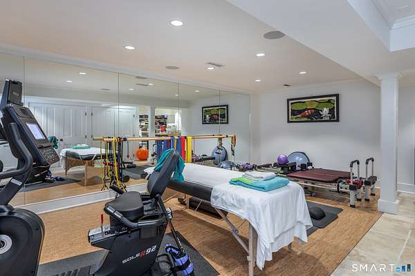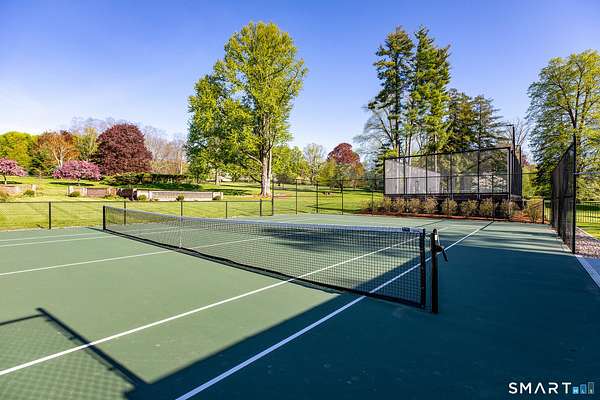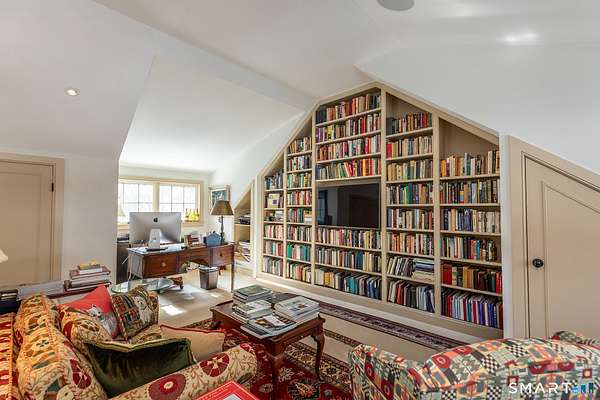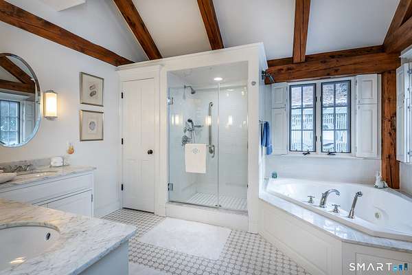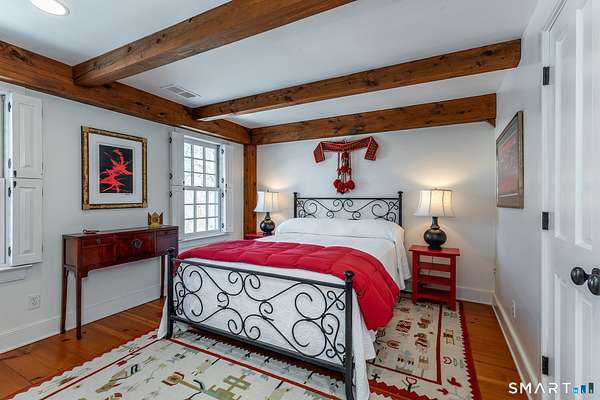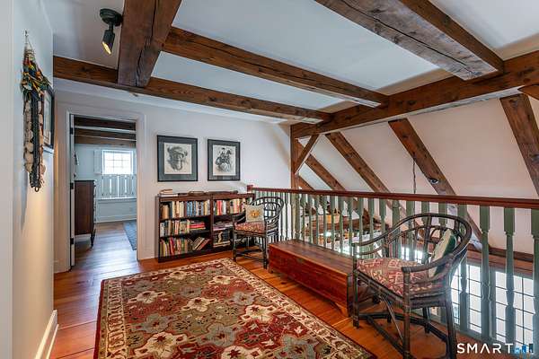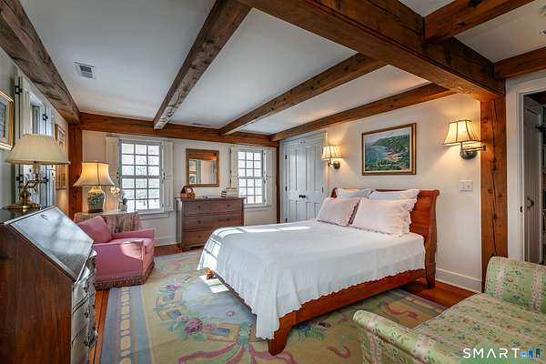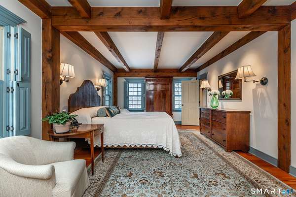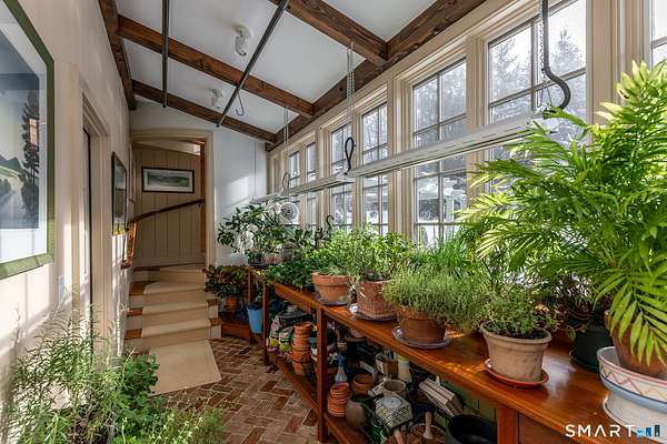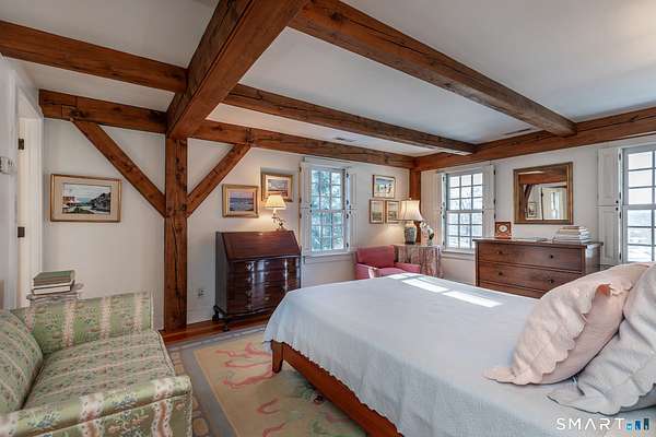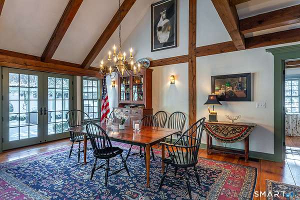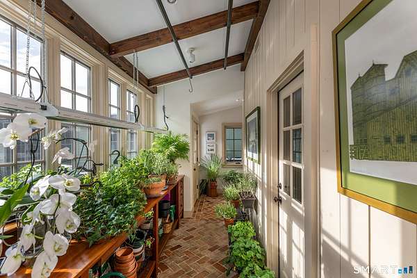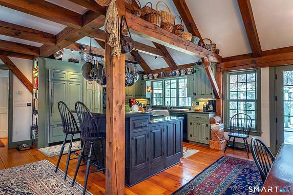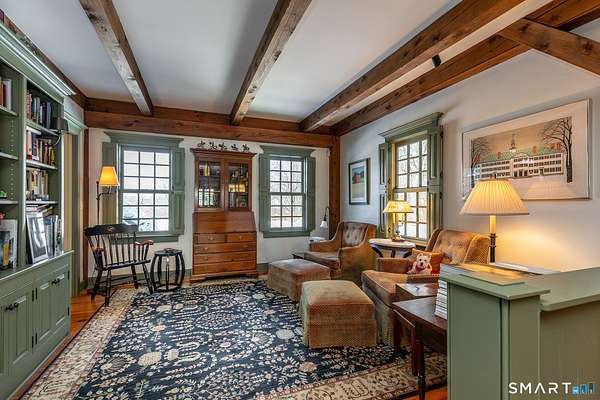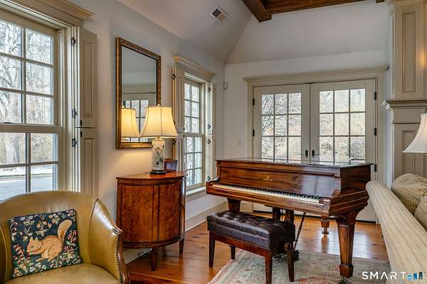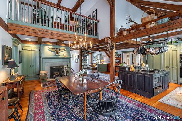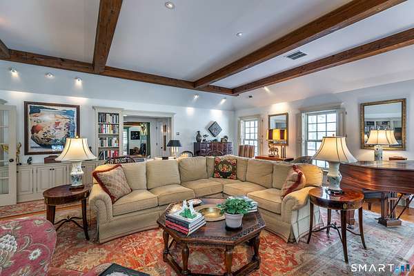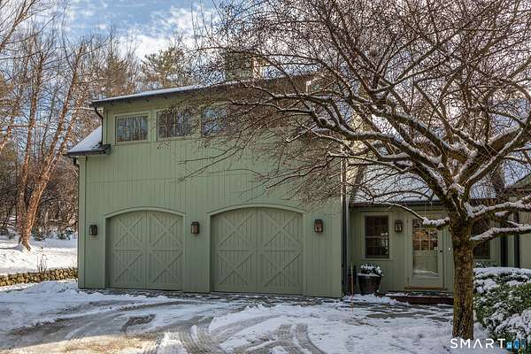 Set back from the road with a sweeping front lawn, this stately Sharon home provides country elegance and privacy in an ideal location. Steps from the historic Sharon Green and within the prestigious Great Elm community, this distinguished residence totaling over 6,000 sq. ft. offers a rare blend of sophisticated design and the serene, pastoral charm for which Litchfield County is known. The heart of the home is a breathtaking open-concept kitchen and dining area, characterized by wood beams and soaring cathedral ceiling. A stone fireplace anchors the room, creating an atmosphere of rustic warmth. French doors off the kitchen lead to the expansive blue stone terrace, shaded in part by a classic pergola-perfect for al fresco dining. For more refined entertaining there is a grand living room featuring a wood burning fireplace, French doors, wood beams and a wall of bookcases, designed for either intimate evenings or a perfect spot for larger gatherings. The sunny main level primary bedroom features a spacious ensuite bath with walk in shower and jacuzzi tub. Upstairs are 3 lovely bedrooms and 3 full baths. The "Silo" addition is accessed through an indoor garden to a winding staircase at the back of the home. With its circular footprint and dramatic lines, it serves as the ultimate media room, library, or private study. The finished lower level offers a gym, expansive wine cellar, pantry area with a Subzero, and cedar closet.