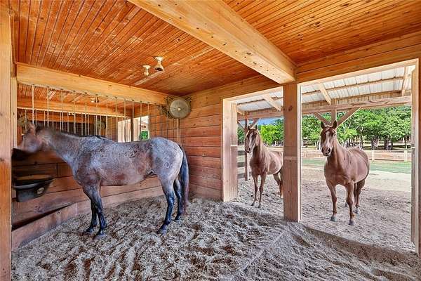 Welcome to your dream estate, nestled behind a gated entrance on 6.8 beautifully maintained AG-exempt acres. This one-of-a-kind property blends refined luxury with country living, offering the ultimate in privacy, comfort, and functionality. Step inside to discover rich hickory scraped wood floors, 4 spacious bedrooms, 7 bathrooms, a spacious office with custom cabinets, and a dedicated hobby room complete with a cozy fireplace. The gourmet kitchen is a chef's dream with an open layout that flows seamlessly into the main living areas. Entertain with ease thanks to a full wet bar equipped with a wine fridge and built-in ice maker, and a whole-home surround sound system that sets the perfect mood. The luxurious primary suite includes an updated spa-style shower and his and her closets, while the upstairs game room with a full bar and media room with a 3D projector and private bathroom provide endless entertainment. Step out onto the balcony for elevated views of your serene surroundings. Step outside to an entertainer's paradise: a heated saltwater pool with spa, an outdoor shower, and a large covered patio boasting a built-in kitchen and fireplace, ideal for year-round gatherings. Equestrian and hobby enthusiasts will appreciate the 66x42 horse barn with 6 custom stalls, tack room and wash rack, as well as the 40x60 fully insulated metal workshop with electric--perfect for any project. A fully stocked pond with an aerating fountain adds natural beauty, while the 750-ft deep well with a powerful 2-stage 5 HP pump to keep your pond and barn troughs full at all times. An R5 tornado shelter provides peace of mind. This estate offers a rare opportunity to enjoy upscale living with agricultural advantages-- in highly rated Argyle ISD and just a short drive from city amenities. Don't miss your chance to own this extraordinary retreat.