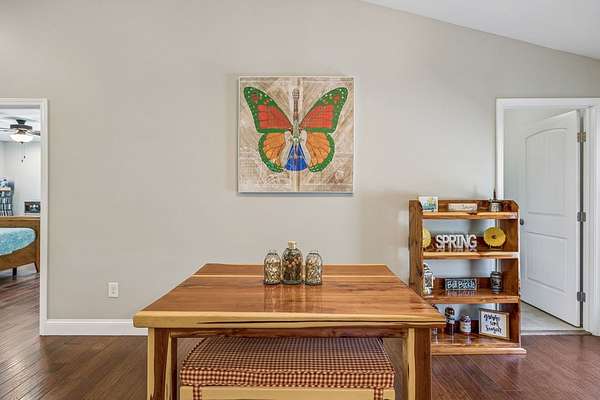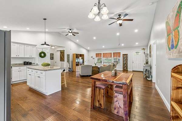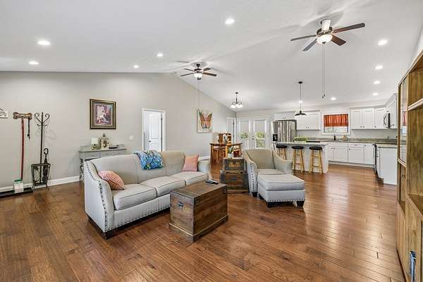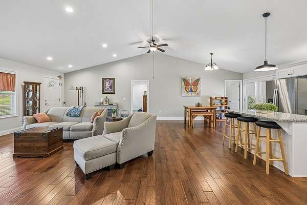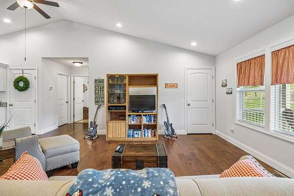 Immaculately maintained home on 1.82 ACRE LOT. Room for a garage too!! This home features a split floor plan for added privacy and a very large open-concept living room, kitchen, and dining area, all with vaulted ceilings for a bright and spacious feel. The primary suite includes a walk-in closet, double vanities, and convenient laundry access from both the primary bath and kitchen. Engineered hardwood floors run throughout the home, with tile flooring in the bathrooms and laundry room. Additional highlights include recessed lighting, granite countertops, large pantry and white cabinets. Enjoy relaxing on the covered front porch or entertaining on the large back deck overlooking the private backyard. TDEC septic approval is for a 2 bedroom home. Curtains will not remain.