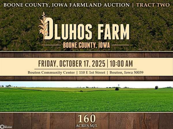 Boone County, Iowa Farmland Auction - October 17th in Bouton, Iowa at 10AM! Tract 2 consists of 160 acres m/l with 135.92 FSA cropland acres and a CSR2 soil rating of 86, well above the Boone County, Iowa average CSR2 soil rating of 75.5. Prominent soil types include highly productive Clarion loam, Webster clay loam, and Nicollet loam. Access to the farm is from the west off K Avenue, and the farm is located northeast of Bouton, Iowa, and northwest of Woodward, Iowa, in Section 26 of Peoples Township, Boone County, Iowa. The balance of the tract consists of grass waterways and a 22-acre nature retreat established by the previous owner. It includes a man-made pond, three dams, a south-flowing creek, timber, and a 12' x 20' shed built in 2000. Historical imagery indicates the non-tillable area was smaller than it is today, and an incoming buyer could add additional cropland acres to the farm or continue its use as a nature retreat. Contact the listing agent for more details. Water flows towards the pond and is directed south off the property, eventually outletting into the Little Beaver Creek, just east of Bouton, Iowa. Prior to any drainage improvements, a Wetland Determination will need to be completed.