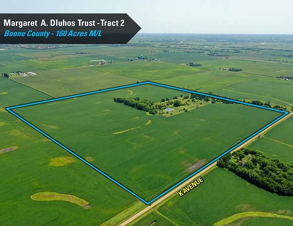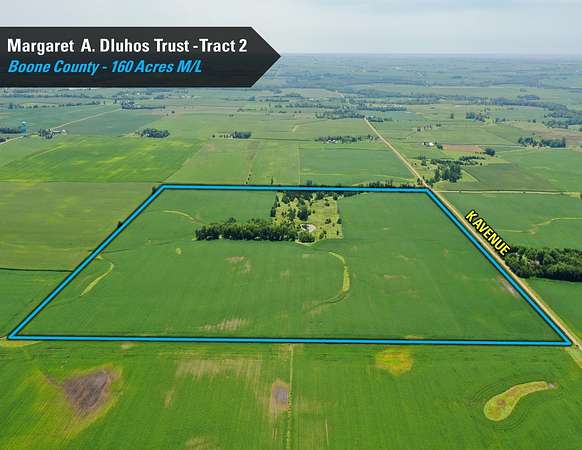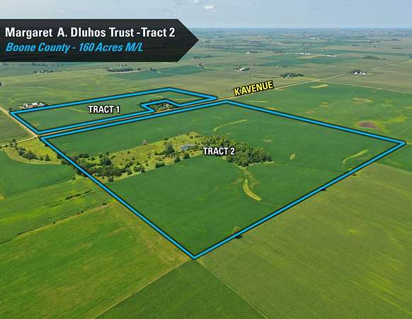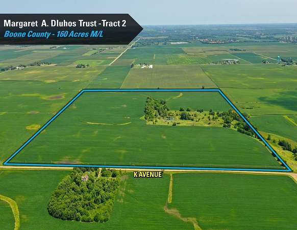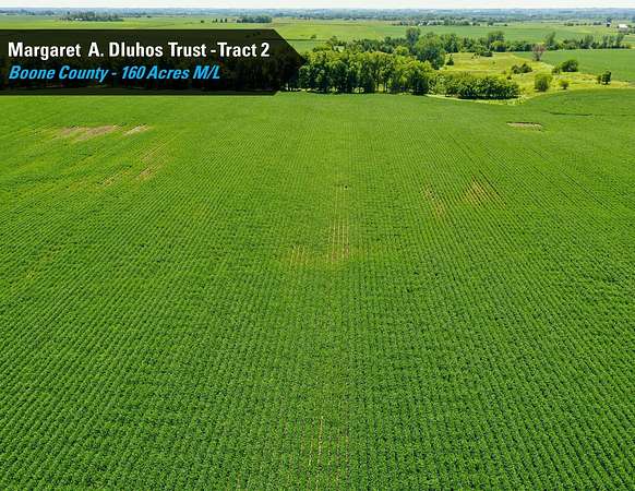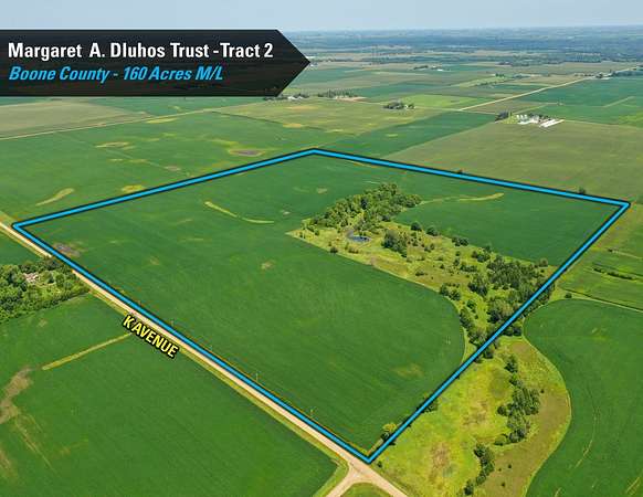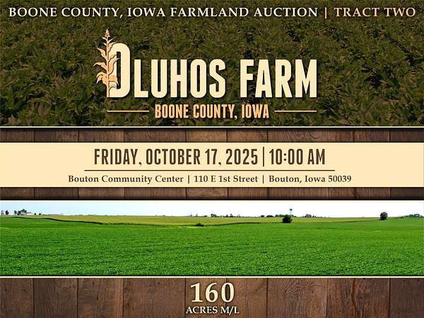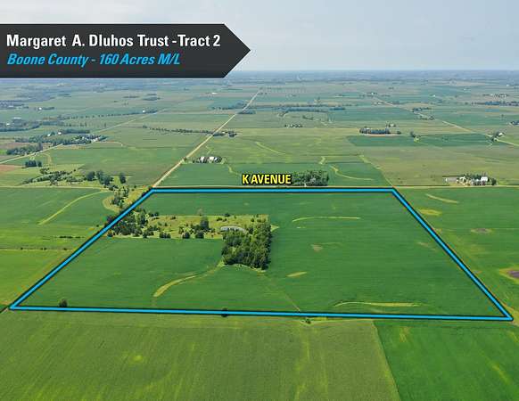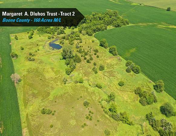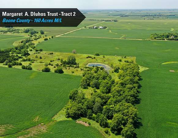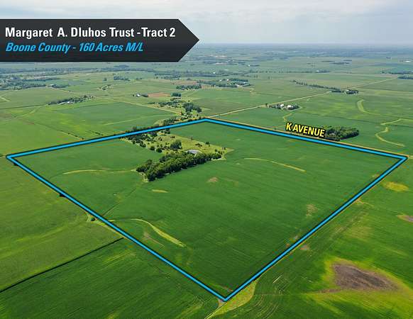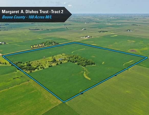 Boone County, Iowa Farmland Auction - October 17th, 2025 in Bouton, Iowa at 10AM! Tract 2 consists of 160 acres m/l with 135.92 FSA cropland acres and a CSR2 soil rating of 86, well above the Boone County, Iowa average CSR2 soil rating of 75.5. Prominent soil types include highly productive Clarion loam, Webster clay loam, and Nicollet loam. Access to the farm is from the west off K Avenue, and the farm is located northeast of Bouton, Iowa, and northwest of Woodward, Iowa, in Section 26 of Peoples Township, Boone County, Iowa. The balance of the tract consists of grass waterways and a 22-acre nature retreat established by the previous owner. It includes a man-made pond, three dams, a south-flowing creek, timber, and a 12' x 20' shed built in 2000. Historical imagery indicates the non-tillable area was smaller than it is today, and an incoming buyer could add additional cropland acres to the farm or continue its use as a nature retreat. Contact the listing agent for more details. Water flows towards the pond and is directed south off the property, eventually outletting into the Little Beaver Creek, just east of Bouton, Iowa. Prior to any drainage improvements, a Wetland Determination will need to be completed.
