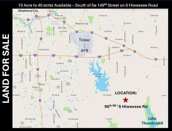 10 ACRES - TRACT 2 - RURAL PARADISE EAST OF NORMAN - NO RESTRICTIONS - ZONED A-2 with up to 40 acres available! Own your own slice of Oklahoma heaven just 15 minutes east of Norman! This 10 acre tract offers the perfect blend of privacy, elevation, and convenience - nestled between Stanley Draper Lake and Lake Thunderbird in one of Cleveland County's most scenic areas. This property features rolling terrain, mature trees, and a beautiful pond - ideal for livestock, fishing, or simply relaxing by the water. With no HOA, no flood zone, and no restrictions, you have complete freedom to build your dream home, establish a hobby farm, or create your own secluded retreat surrounded by nature. The A-2 Rural Agricultural Residential zoning supports a wide range of uses while maintaining a peaceful country atmosphere. Enjoy breathtaking panoramic views and stunning Oklahoma sunsets from your elevated homesite. Located just 13 miles from Moore, 16 miles from the University of Oklahoma, 25 miles from downtown OKC, and less than 10 miles from Lake Thunderbird State Park, this property combines quiet country living with quick access to city amenities and major highways, including I-40. Don't miss this rare opportunity to own a truly exceptional piece of land in one of Norman's most desirable rural settings - where your vision for country living can become reality. OGE Electric, OEC Fiber - please note that well and septic/aerobic by buyer! Please have buyer verify their own utility needs. Buyer Brokers welcome!