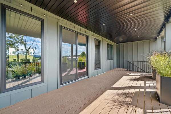 An enlarged covered deck extends the living area toward the horizon, providing a stage for morning coffee, afternoon sun, and evening gatherings while indulging in the mountain views. This design feature enables seasonal living and a sense of connection with the landscape.