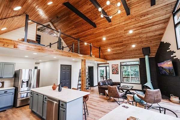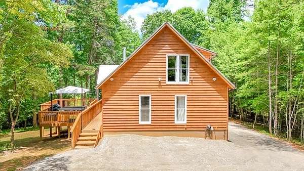 Nestled on 2.77 private acres and surrounded by the quiet beauty of nature, this fully renovated 6-bedroom, 3-bath chalet-style retreat offers the perfect balance of mountain charm and modern comfort. Thoughtfully updated from top to bottom, every detail has been considered. Inside, soaring cedar ceilings and an open, light-filled floor plan create a warm and inviting atmosphere, anchored by the stunning floor-to-ceiling windows in the living room that frame the outdoors beautifully. With two brand-new full kitchens, the layout offers incredible flexibility - ideal for entertaining, hosting extended family, multi-generational living, or maximizing rental potential. Major upgrades provide true peace of mind, including a new roof, high-efficiency heat pump systems, water softener, complete 400-amp electrical rewire, new windows (with the exception of the statement living room windows), and new doors throughout. Outdoor living is just as impressive. A brand-new deck with a private hot tub invites you to unwind, while the custom firepit with stadium-style seating creates the perfect gathering space under the stars. A newly installed parking pad with EV charging adds a thoughtful touch of modern convenience. Located just 25 minutes from Blue Ridge and Murphy, NC, and only 20 minutes from McCaysville, you'll enjoy easy access to dining, shopping, and outdoor adventure - all while coming home to your own private mountain escape. Whether you're searching for a full-time residence, weekend getaway, or turnkey investment property, this chalet offers versatility, comfort, and timeless mountain appeal.