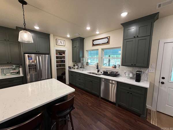 Newly built home (2024) that sits on the back of 3 wooded acres just 8 minutes from Hwy 65 and 15 minutes from Conway! Country life, but still just a short drive into town. 3 bedroom/2 bath 1,817 sq. ft. Private driveway. Home is on a slab, and extremely well built with 6'' exterior walls, prefab engineered trusses, spray foam insulation, LP SmartSide board and batten siding. Home has custom built cabinets/vanities, granite countertops, 12' vaulted ceiling in living room, 9ft ceilings everywhere else, large walk-in pantry, gas stove top, gas log fireplace, custom tile shower in master bath, Bermuda sodded yard, and more! Full length porches on front and rear of home (1,000 sq.ft.). 30'x30' carport. 10'x10' well house that doubles as a good area for storage. Well produces great water at 15 gallons per minute! Water your yard and garden as much as you want! Fiber internet was just recently installed throughout the neighborhood and is available.