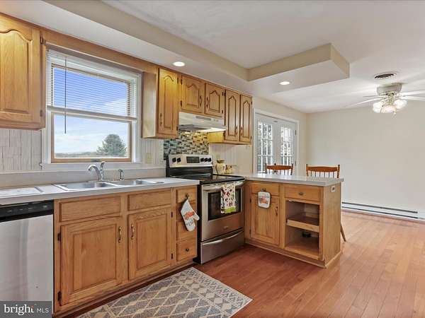 - Ceiling Fan(s), Combination Kitchen/Dining, Table Space Kitchen, Traditional Floor Plan, Wood Floors