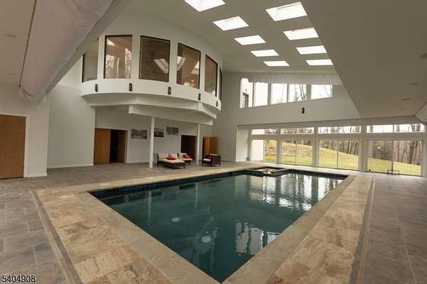 A rare architectural statement where scale, sophistication, and elevated luxury converge. Set on 3.7 private acres, the residence spans approximately 13,000 sq ft with 7 bdrms, 7 full baths and 2 half baths, designed for both grand entertaining and refined everyday living. From arrival, striking architectural lines, dramatic volume, and curated sight lines create a 'WOW' factor. The grand living room unfolds as a stunning open-concept space with soaring 32-ft ceilings, a sculptural spiral staircase, and a 2-sided 16-ft gas fireplace. Floor-to-ceiling windows flood the home with natural light, while views extend to the sun-drenched, heated indoor pool. The chef's kitchen pairs performance with modern design, featuring Wolf and Sub-Zero appliances, multiple ovens, wine refrigeration, coffee system, and premium finishes throughout. The main level also offers a private theater, gym, office, and first-floor au pair ensuite. The second level is anchored by a luxurious primary suite sanctuary with 20-ft ceilings, dual balconies, loft, sitting room, dual walk-in closets, and a spa-inspired bath with separate water closets and bidet. 5 addt'l bdrms include 3 ensuites and private balcony access.The lower level showcases the indoor pool, a 1,200-sq ft ballroom, dry sauna, full bath, and flexible space ideal for a wine room, cigar lounge, or recreation area. Additional highlights include a 4 car heated garage and dedicated elevator shaft. A truly one-of-a-kind Mendham estate!