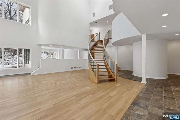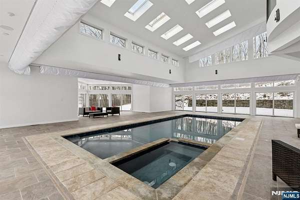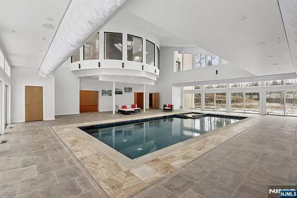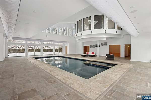 A rare architectural statement where scale, sophistication, and elevated luxury converge. Set on 3.7 private acres, the residence spans approximately 13,000 sq ft with 7 bdrms, 7 full baths and 2 half baths, designed for both grand entertaining and refined everyday living. From arrival, striking architectural lines, dramatic volume, and curated sightlines create a 'WOW' factor. The grand living room unfolds as a stunning open-concept space with soaring 32-ft ceilings, a sculptural spiral staircase, and a 2-sided 16-ft gas fireplace. Floor-to-ceiling windows flood the home with natural light, while views extend to the sun-drenched, heated indoor pool. The chef's kitchen pairs performance with modern design, featuring Wolf and Sub-Zero appliances, multiple ovens, wine refrigeration, coffee system, and premium finishes throughout. The main level also offers a private theater, gym, office, and first-floor au pair ensuite. The second level is anchored by a luxurious primary suite sanctuary with 20-ft ceilings, dual balconies, loft, sitting room, dual walk-in closets, and a spa-inspired bath with separate water closets and bidet. 4 addt'l bdrms include 3 ensuites and private balcony access.The lower level showcases the indoor pool, a 1,200-sq ft ballroom, dry sauna, full bath, and flexible space ideal for a wine room, cigar lounge, or recreation area. Additional highlights include a 4 car heated garage and dedicated elevator shaft. A truly one-of-a-kind Mendham estate!