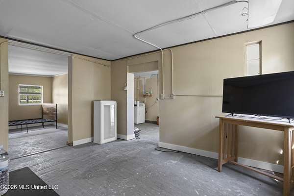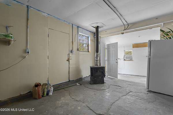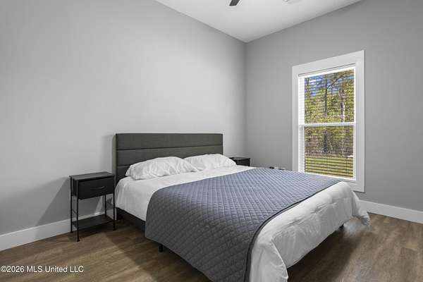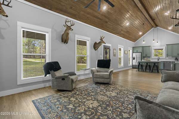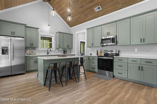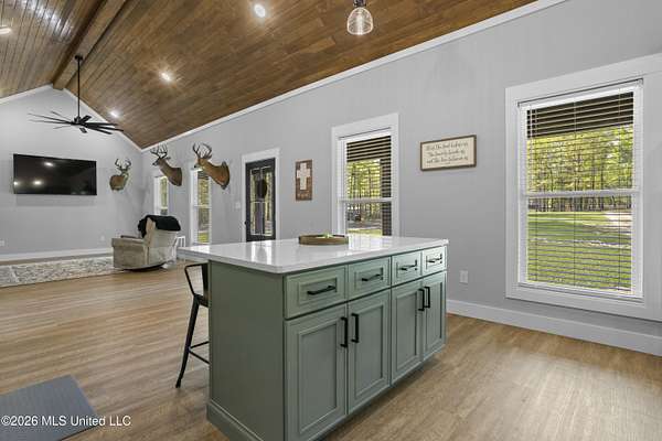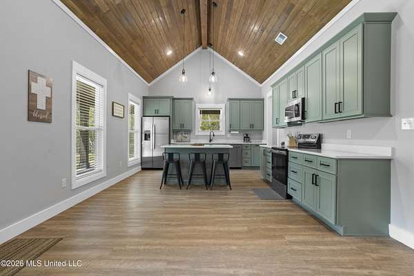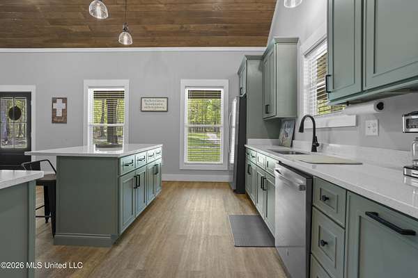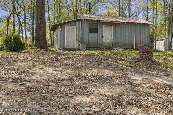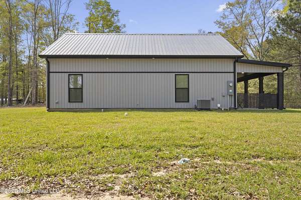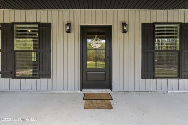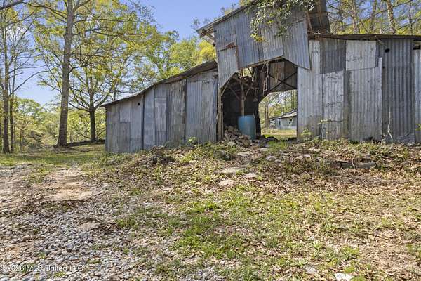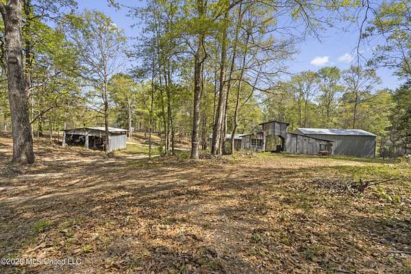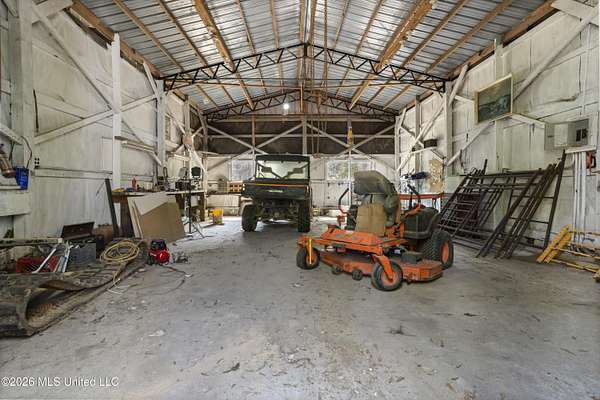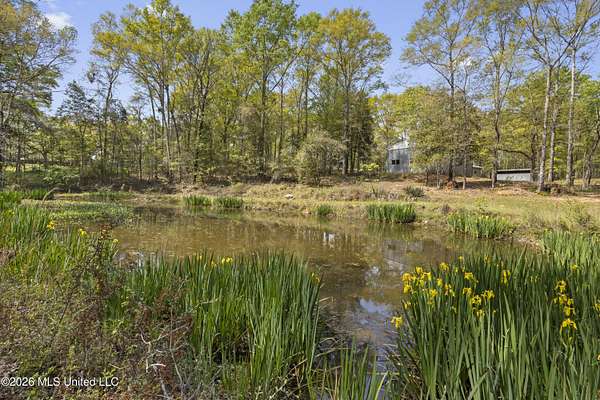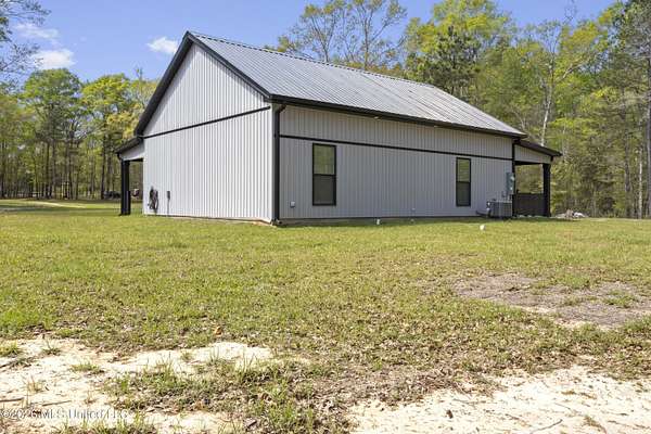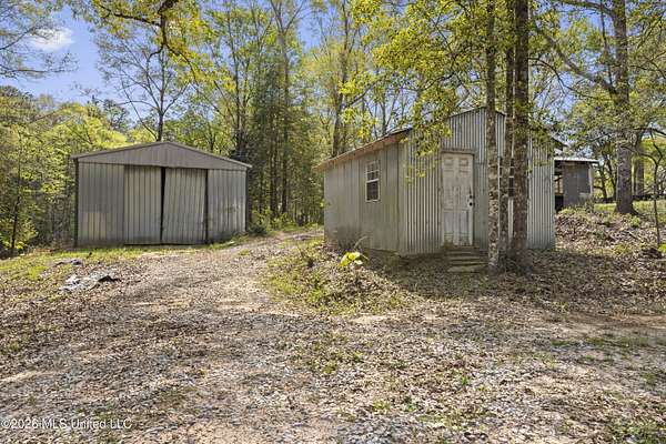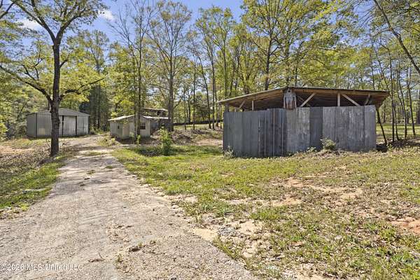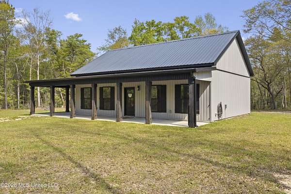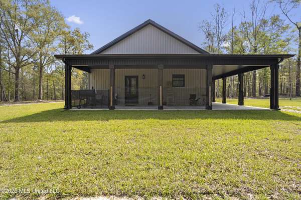 Charming 2-bedroom, 2-bath home on 7.55 acres, built in 2025, set back on a long private driveway. The home features tall ceilings and shiplap in the kitchen and living area, creating a clean, modern farmhouse feel. The spacious kitchen includes a large island that overlooks the living room, making the main living space open and functional. A metal roof adds durability and low maintenance, and a carport on the side provides convenient covered parking. The front porch stretches across the entire front of the home, offering a comfortable spot to sit and enjoy the property. The land is mostly cleared with scattered trees, fully fenced, and laid out for practical use. Multiple outbuildings add significant value, including a large workshop, a separate 500 sq ft apartment, and a pond. This property is well-suited for someone looking for a newer home, usable acreage, and room for hobbies, equipment, or extended living space.