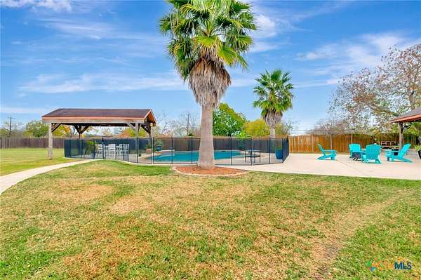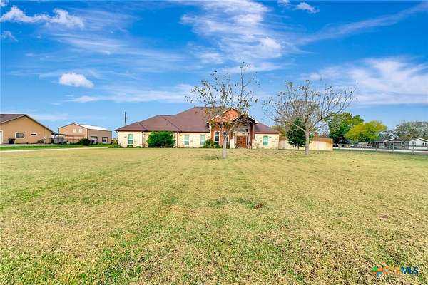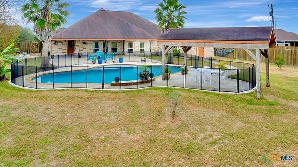 Don't miss this exceptional custom-built ranch-style home, thoughtfully designed for both comfort and entertaining. From the moment you step through the double front doors, you're welcomed into a spacious open-concept layout that showcases everything this home has to offer. The expansive living area features a stunning beamed ceiling and a stone gas fireplace, creating a warm and inviting focal point. The gourmet island kitchen is a true showstopper, offering custom cabinetry with granite countertops, a wrap-around breakfast bar, gas cooktop, walk-in pantry, and plenty of space for gathering. Beautiful wood-look tile flooring flows throughout the home, adding style and durability. The oversized fourth bedroom offers versatility and can easily serve as a second living area, game room, or flex space, complete with generous closet storage. The primary suite is a relaxing retreat with an ensuite bath featuring double vanities, a tiled walk-in shower, a jetted tub, and a spacious walk-in closet. Additional highlights include a centrally located indoor laundry room with excellent storage, plus a private office with built-in desk and its own exterior entrance-perfect for working from home. The home is also equipped with a Generac whole-home generator, providing peace of mind and uninterrupted comfort. Outside, enjoy covered patios in both the front and back, a fenced yard, an in-ground pool, and a pool house with a convenient half bath. This home truly has it all-schedule your private showing today!