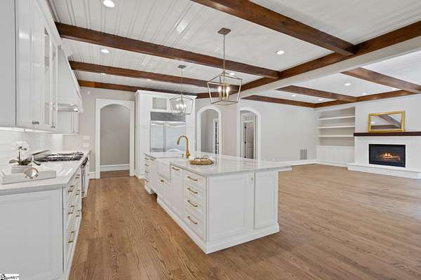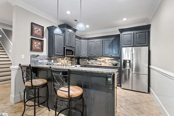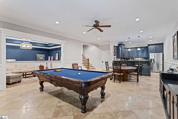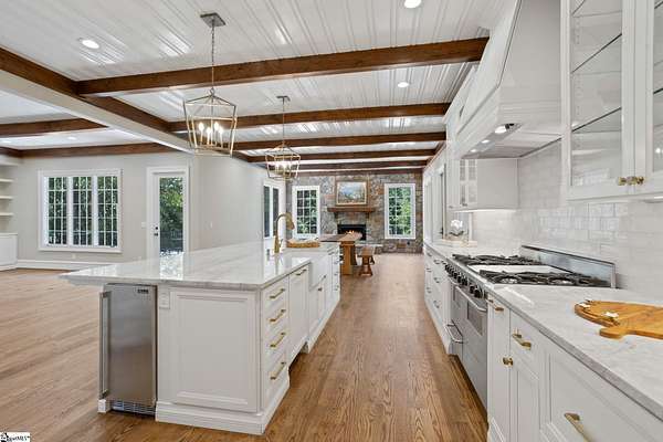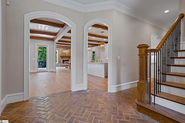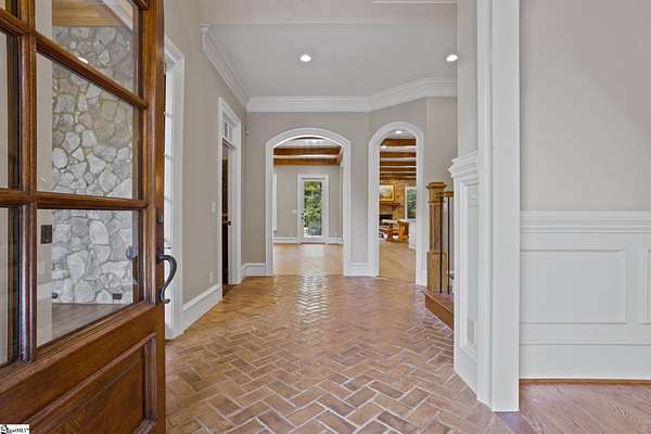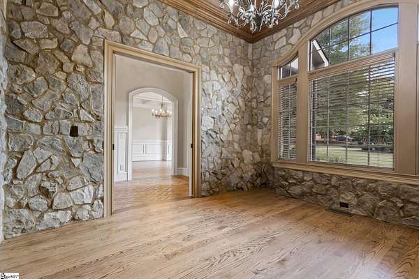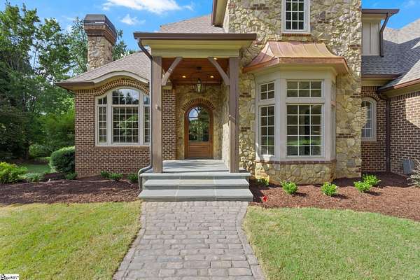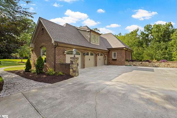 Presented by Ronnetta Griffin, Griffin Fine Real Estate (864) 884-8369. FAIRY TALES DO COME TRUE...especially at Maison Claire de Lune, a private European-inspired estate nestled within the prestigious gated enclave of Kingsbridge in Five Forks. Perfectly sited at the end of a quiet cul-de-sac on nearly two wooded acres along the banks of Peters Creek, this timeless residence--originally built by its current owner--has been exquisitely reimagined after a year-long renovation of both interior and exterior spaces. Every surface has been thoughtfully refreshed, reconfigured, or replaced to reflect a sophisticated yet livable elegance. Highlights of the renovation include: a completely redesigned kitchen with Taj Mahal quartzite countertops, custom cabinetry, new hardware, lighting, and fixtures; the removal of a wall to create a more open flow between the kitchen and great room; an entirely rebuilt walk-in pantry with a secondary dishwasher and sink; and a newly imagined primary suite with an expanded "hers" closet featuring a makeup vanity and custom cabinetry. The primary bathroom has been transformed with new vanities, countertops, flooring, and a stunning shower. Additional enhancements include a new brick fireplace surround with custom built-ins in the great room, newly refinished tongue-and-groove ceilings, fresh paint throughout the entire home in Sherwin-Williams Accessible Beige, refinished hardwood floors including stairs and railings, and new hardwoods added to seven rooms across the second floor and basement. A second powder room was refreshed, a heavy glass shower door was added upstairs, and dozens of new designer light fixtures were installed throughout. Spanning nearly 10,000 square feet across three finished levels, the home features six bedrooms, six full and two half baths, a formal dining room, bonus and playrooms, a lower-level billiards room, theater/fitness space, and a second full living quarters with its own kitchen, den, and private entrance. A richly textured study, wrapped in hand-laid stone and crowned with a vaulted wood ceiling, includes a wood-burning fireplace and sunlit arched windows--perfect for quiet mornings or inspired work-from-home days. The exterior has been beautifully upgraded as well, with a brand-new architectural roof and gutter system, new bluestone front porch, cobblestone paver walkways in both front and back, enhanced landscaping, and expanded lower parking to accommodate the new pickleball court. Portions of the lot have been regraded and newly sodded, enhancing both usability and curb appeal. Details throughout include custom cabinetry and millwork, Emtek hardware, Moen fixtures, aluminum-clad casement windows, Trane HVAC systems with Aprilaire filtration, closed-cell insulation, central vacuum, structured wiring, and elevator-ready framing to reach all three floors. The home includes upper and lower garages with space for a car collection, workshop, or even a boat. As a rare and valuable addition, the builder/homeowner is available to consult on tailored modifications such as a pool, summer kitchen, or expanded outdoor living--allowing you to personalize this exceptional home in ways rarely available in a resale property. Kingsbridge is one of Greenville County's most beloved gated communities, with beautiful amenities including a clubhouse, pool, tennis, playground, and scenic sidewalks ideal for walking or running. Conveniently located in the heart of Five Forks near award-winning schools and upscale shopping, Maison Claire de Lune is a legacy estate in a truly storybook setting. Visit our website for the complete list of features, a gallery of photographs, a video walkthrough, and additional documents. Then contact us to schedule your private showing--before the moonlight fades.